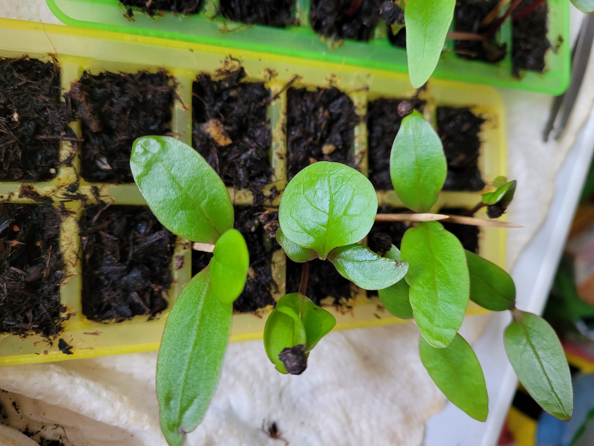 Angehängt zwei Fotos, Zahnstocher for scale. Ein Samenkorn hängt auch noch an einem Sämling.