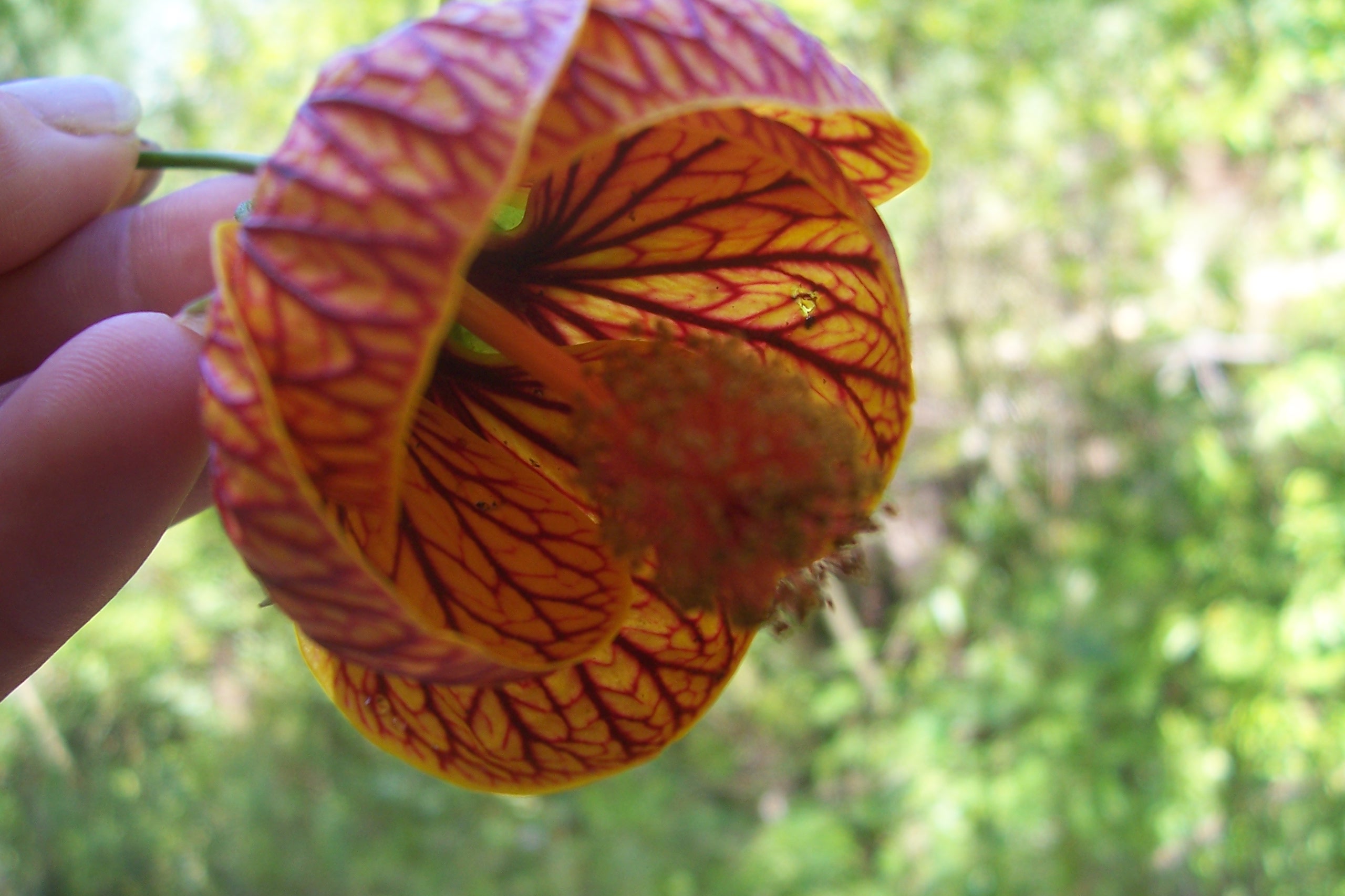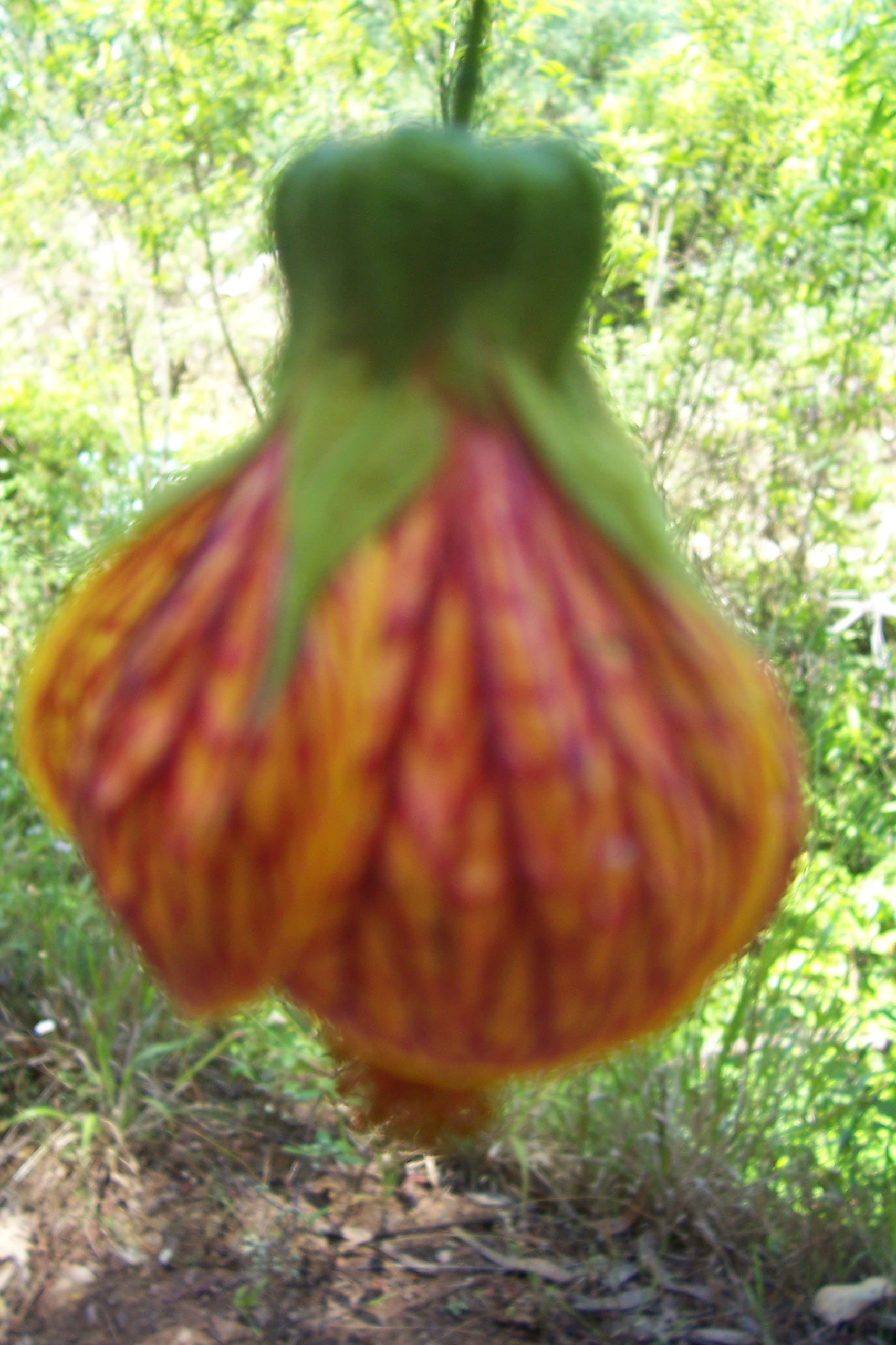 2. Bei einer Händlerin am Straßenrand habe ich drei Knollen gekauft. An der Packung war die unten mit abgebildete Blüte. So soll die Pflanze mal blühen. Für mich sieht die Blüte nach Abutilon aus, aber die Pflanze passt nicht dazu