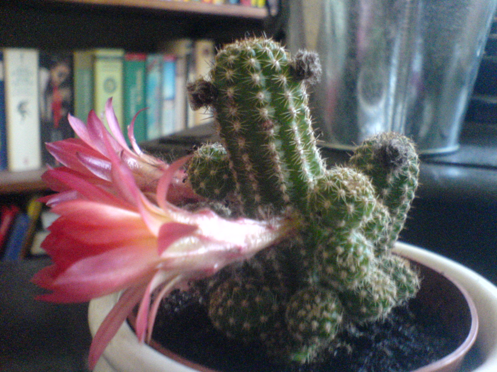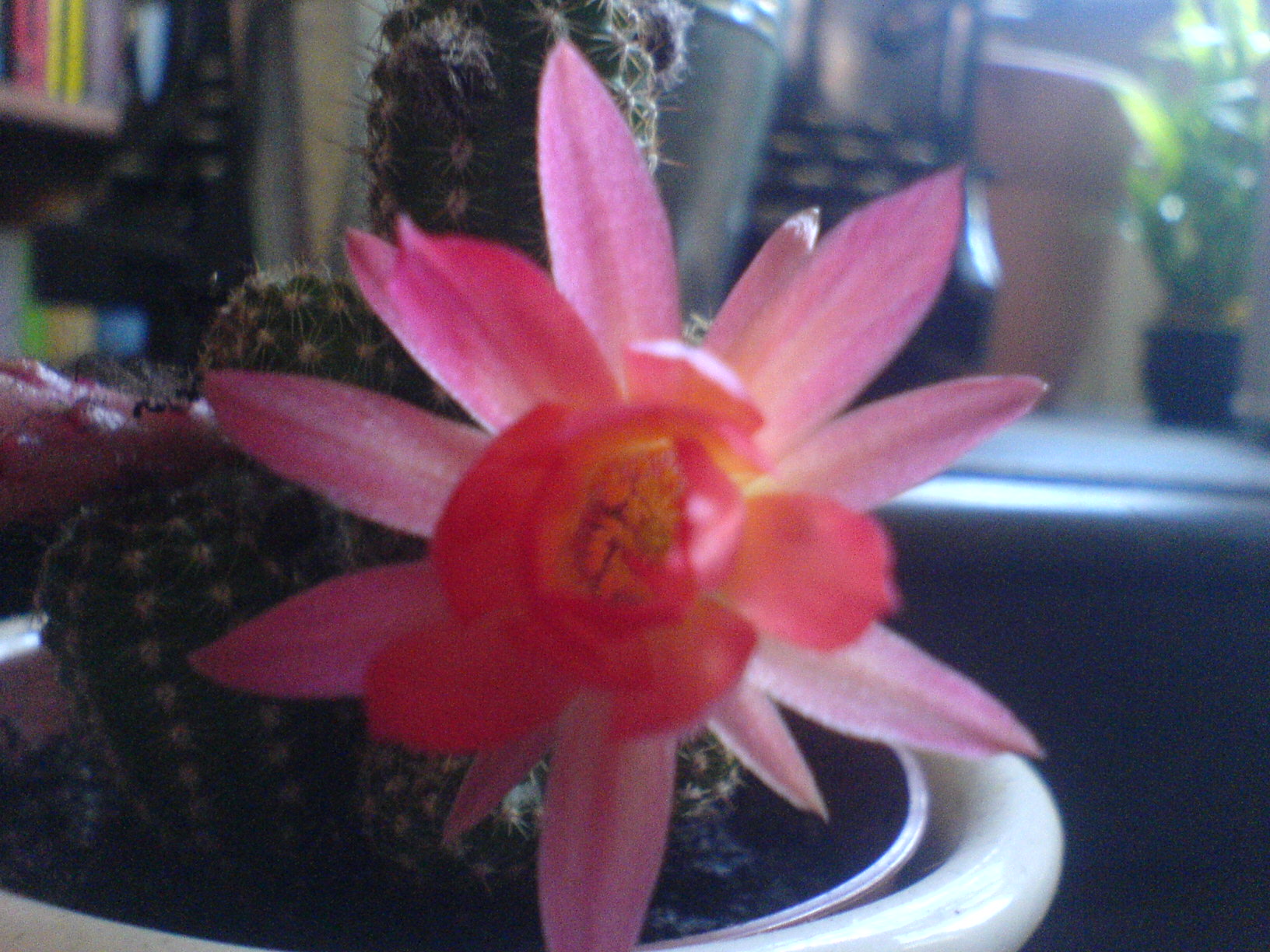 ich hoffe Ihr könnt mir sagen wie dieser kleine Kaktus heißt. Er ist etwa 10cm groß. Leider sind die Bilder mal wieder etwas unscharf wegen Handycam. Vielleicht denke ich ja nächstes Mal endlich daran die Linse vor dem Knipsen zu säubern...