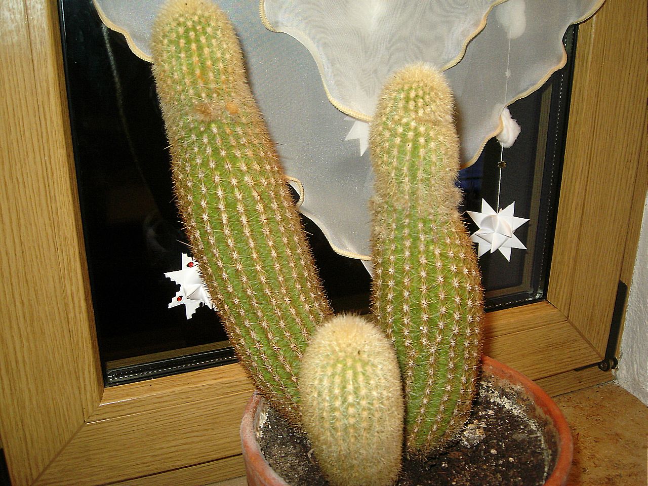 Da ich heute schon mal beim Thema Kakteen bin, würde ich gern von euch wissen was das für ein Kaktus ist. Ich habe ihn seit ca. 3 Jahren, aber irgendwie kommt es mir vor als ob er gar nicht wächst. Bis jetzt habe ich ihn einmal umgetopft und festgestell das die einzige Wurzel die er hat wie ein knorriger fasriger Zweig aussah. Mehr an Wurzel war nicht drann. Vergammelt ist er aber auch nicht, denn er fasst sich fest an.