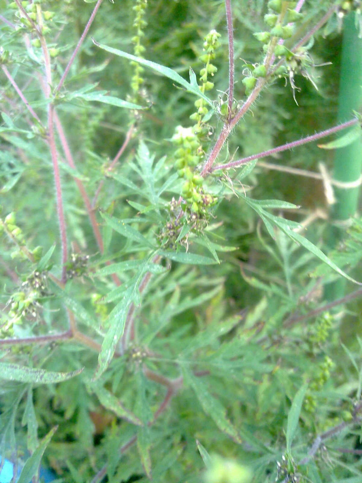 Wahrscheinlich durch Samenflug bei mir gelandet, sah dieser unbekannte Sämling anfangs aus wie eine zu lang und sperrig geratene Tagetes (in diesem Stadium hab ich leider nicht geknipst). Die Blütchen erschienen vor etwa fünf Wochen und sind graugrün (schade! Ich nahm an, es kommt was Blaues oder Rotes) und anscheinend traubig angeordnet, ähnlich wie bei der Brennnessel. Die (einzige vorhandene) nicht verholzende Pflanze ist mittlerweile 180cm hoch und hat fast einen Meter Umfang an der breitesten Stelle. Die Blütenstände befinden sich ziemlich in einer Höhe, in der Mitte aber klar am höchsten. Deutlich erkennbar sind die rot überhauchten Triebe, die Blätter sind tief gelappt, fast bis zur Mittelrippe. Morgen schau ich mir nochmal die Blatt- und Triebstellungen an, ich meine Wechselständigkeit vorherrschend, vielleicht sind aber die Blütenstände von gegenständigen Nebenblättern umarmt.