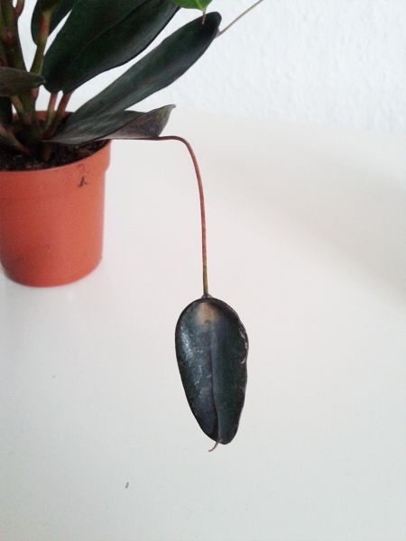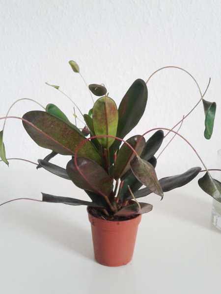 Die Blätter fühlen sich insgesamt ledrig an, etwa wie bei einer Schefflera. Teilweise sind die Unterseiten rötlich gefärbt. Die Wuchsform würde ich als aufrecht beschreiben, aber dafür ist die Pflanze noch zu klein.