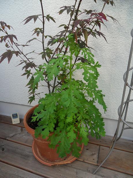 Hallo, wer kann uns sagen, was neben dem japanischen Ahorn sich da in dem Topf auf unserer Terrasse eingenistet hat ?