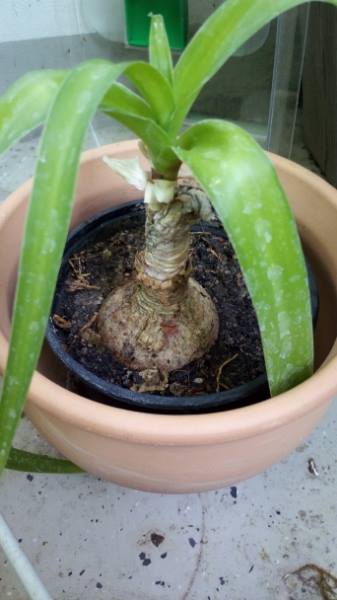 Hallihallo. Mich treibt schon seit Tagen die Frage um, was für eine Pflanze ich hier hab. Ich mache derzeit eine Ausbildung zur Floristin und schon allein aus diesem Grund bin ich immer daran interessiert, die Namen meiner pflanzlichen Schützlinge zu kennen. Doch diese Pflanze hier macht es mir recht schwer... Zu der Pflanze bin ich gekommen, als ich im Lehr-Gewächshaus meiner Berufsschule ausmisten sollte. Tja, und in einer Ecke standen etliche Töpfe mit diesen merkwürdigen Zwiebelpflanzen. Von weitem dachte ich, es seien kleine Yuccapalmen oder so, denn durch den komischen "Stamm" mit dem Blattschopf oben sah das echt so aus. Aber als ich mir die Dinger aus der Nähe anguckte, stellte ich fest, dass unten ja eine Zwiebel/Knolle ist. Und die Blätter sind recht weich und erinnern stark an das Laub von z.B. Ornithogalum caudatum (habe ich nämlich selber am Fenster stehen). Ich fragte die Gärtnermeisterin, ob sie nicht wisse, was das für Pflanzen sind. Nein, das weiß sie nicht. Die Pflanzen stammen vom inzwischen pensionierten Gärtnermeister, er habe von seinen Urlaubsreisen gern mal botanische Mitbringsel mitgebracht, für gewöhnlich ohne den Namen der Pflanzen zu kennen. Und die Lehrlinge dürfen sich dann einen Kopf machen, was da so im Gewächshaus rumsteht ^^ Jedenfalls hat mir die Gärtnermeisterin dann einen Topf mit der seltsamen Zwiebelpflanze in die Hand gedrückt, damit ich sie mit nach Hause nehme. Ich recherchiere nun schon Tag für Tag, weil ich wissen will, was das nun sein könnte. Ist auf jeden Fall ein Zwiebelgewächs. Unter der grau-bräunlichen Hülle kam nach ein bisschen Pulen eine helle Zwiebel zum Vorschein. Aber eine Meerzwiebel oder ein Ornithogalum ist es nicht, schon allein der komische "Stamm" passt ja nicht dazu. Bin dann vorhin auf Hakenlilie (Crinum) gestoßen. Könnte das vielleicht die Lösung sein? Was denkt ihr? Ist hier jemand, der sich auskennt?
