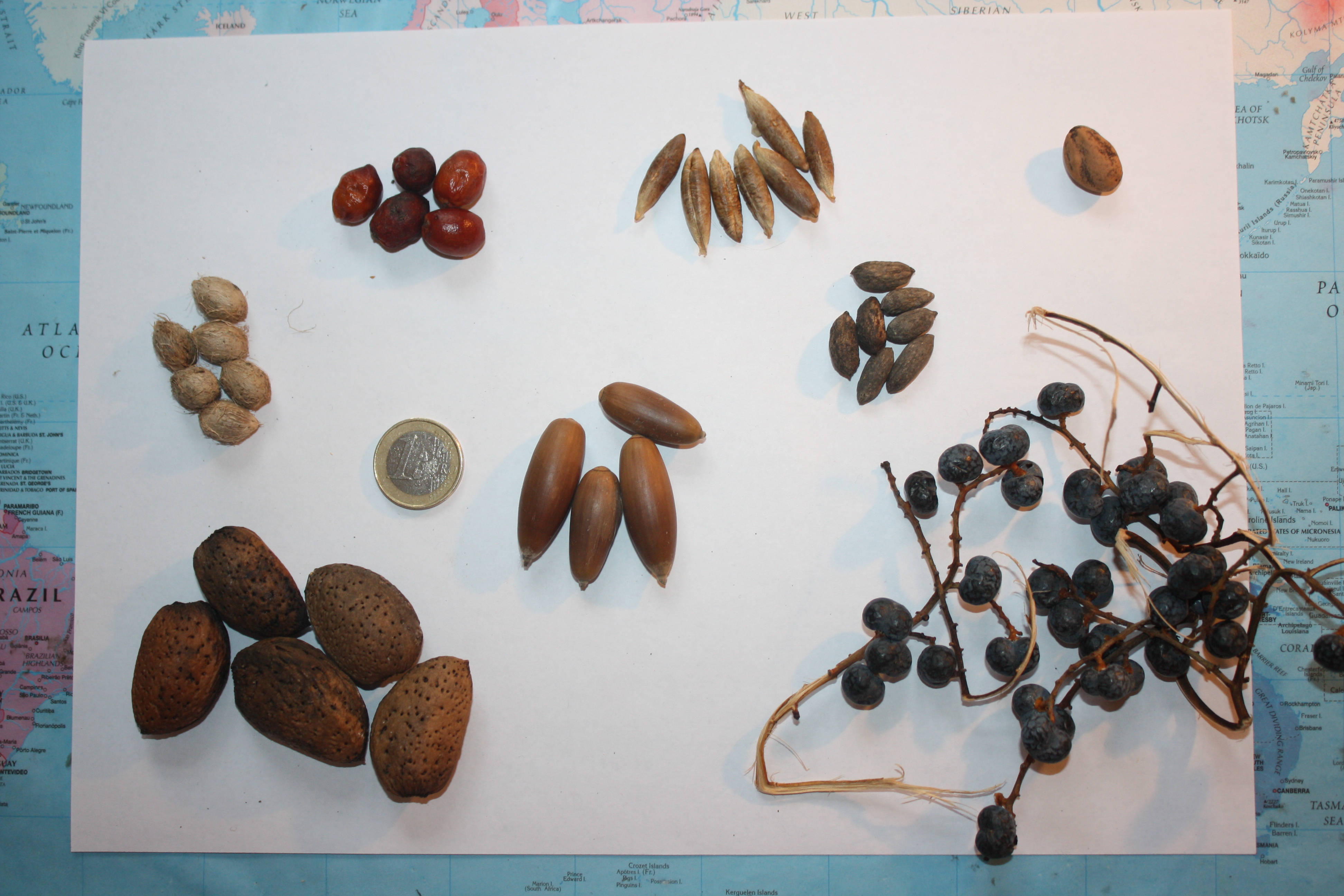 Zum anderen würde es mich noch interessieren, was die unten im Bild abgebildeten eichelförmigen Früchte und die Nüsse, die ich vom Palatin und Aventin gesammelt habe, sein könnten:
