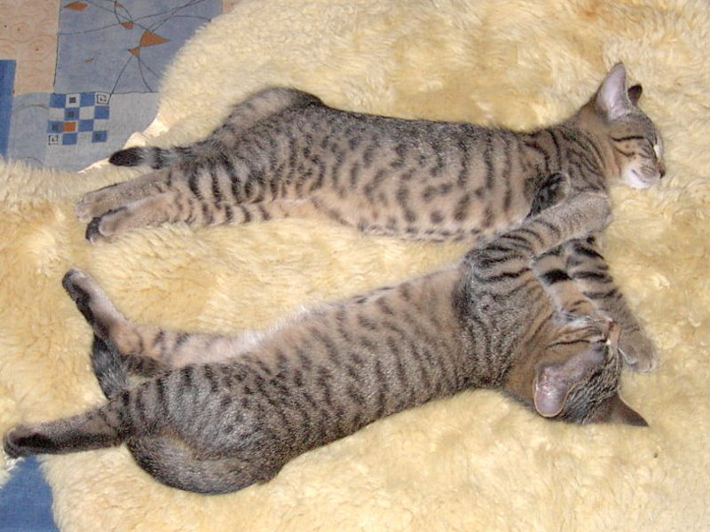 Wir waren uns am Anfang unsicher, ob nicht doch ein Kater dabei ist und dann haben wir ein Junges, das viel pummeliger war, Maxi-Bommel genannt und die andere Lisa. Es ist dann bei Bommelchen und Lischen geblieben. Von der Fellzeichnung gibt es echt keinen Unterschied, von der Statur und dem Verhalten allerdings schon