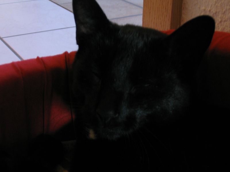 Es ist ein Kater, auch wenn man ihm das ned ansieht. Aber, dass der ganz schwarz ist muss ich dich enttäsuchen *g*. Der hat am der Kehle noch einen weißen Fleck und am Bauch halt vereinzelte weiße Haare. Und in der Sonne ist er eher braun Das ist ein Chameleonkater