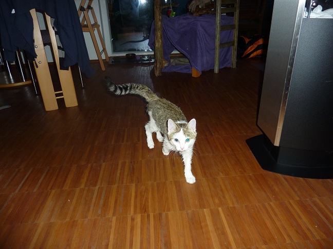 Ich habe keine Ahnung, wo sie den Wurstzipfel her hatte. Vielleicht ist er beim Wegwerfen neben dem Mülleimer gelandet oder sie hat ihn schlicht vom Tisch geklaut...