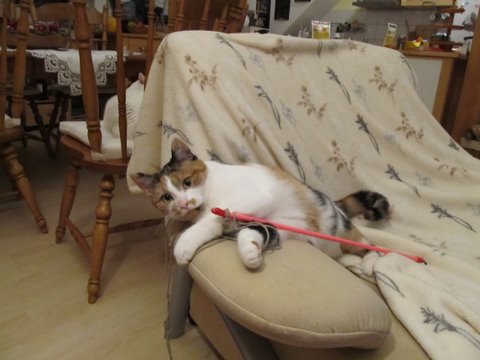 Den Federpuschel kriegen sie auch nicht zur alleinigen Verfügung, sondern nur, wenn ich ihn in der Hand habe. Ausgerupfte Federn werden weggeworfen.