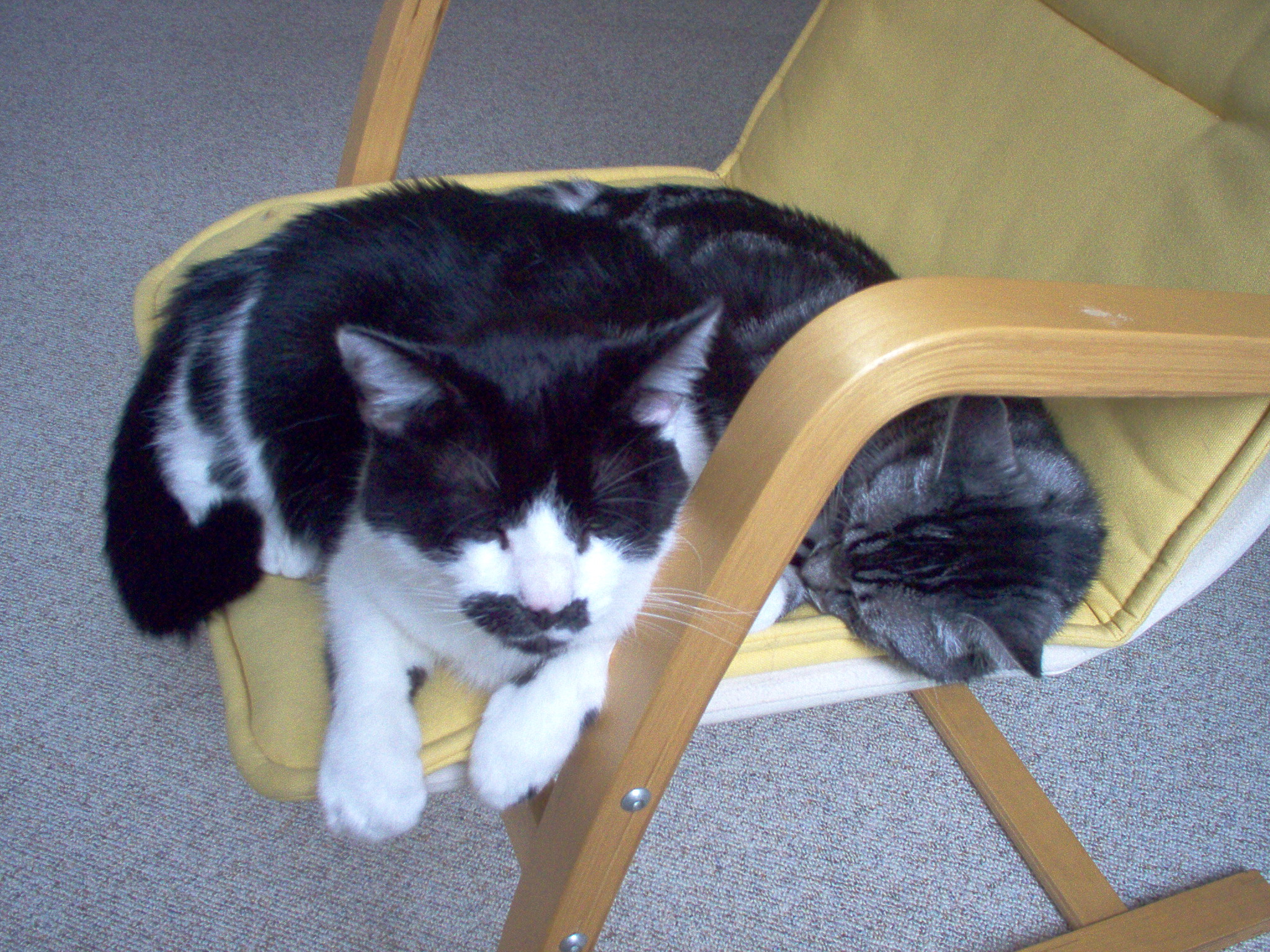 Seit kurzen schlafen unser Dicker und Krümel auch schon mal kurz zusammen auf dem Stuhl. Wo der Dicke sich hinlegt, ist dann allerdings für den Kurzen nicht mehr sooo viel Platz, sodaß es ihm nach einiger Zeit zu eng bzw. auch wohl zu schwer wird
