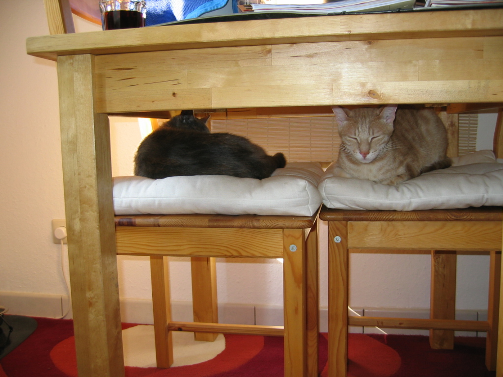 Mann, wenn ich eure Miezis so sehe, bin ich beruhigt, daß mein Mephisto offensichtlich doch normal ist!!! Ich kenn das alles nur zu gut: Diese Verrenkungen bis zur völligen Tiefschlafphase, das Kisten-, Karton- und Körbeschlafen, Schreibtische, direkt auf meinen Unterlagen, Computerbildschirme - bevor der flache kam -, Schranknischen, Stühle unterm Tisch, Waschmaschinentrommel, Koffer unterm Bett, das ungeliebte Katzentransportkörbchen.... all das hat mein Kater auch schon zum Schlafen benützt. Nur Blumentöpfe und den Bügelwäschekorb hat er noch nicht angerührt . Katzen sind einfach wunderbar - ich könnt ihnen ewig beim Schlafen zusehen!!!!