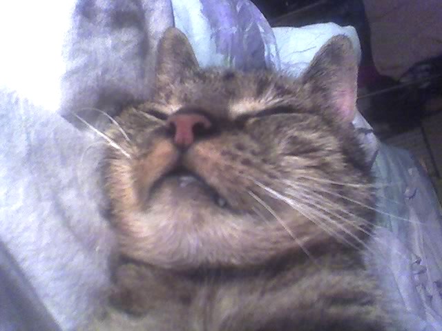 das ist mein 18 Jahre alter blinder "Krümel". Er schläft am schnellsten, wenn man ihn wie ein Baby im Arm hält - wie das früher bei den Puppen war, denen die Augen automatisch zugeklappt sind, wenn sie lagen.