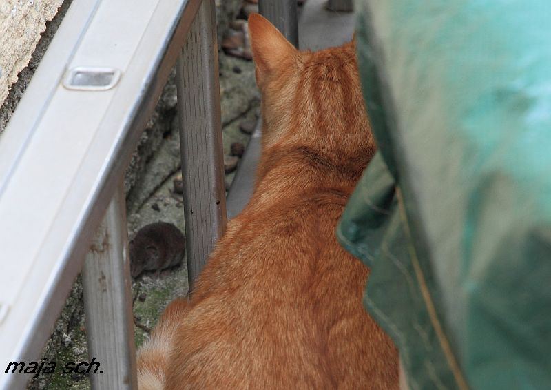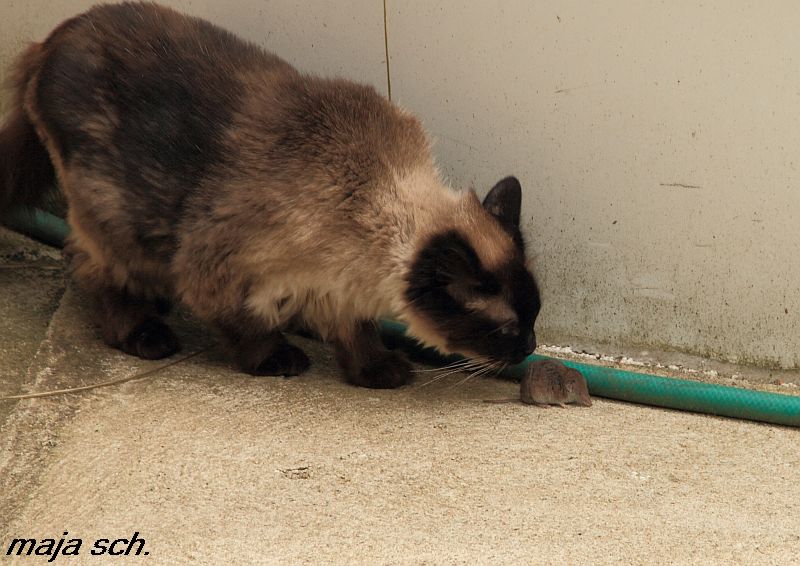 Zuerst hat er eine angebracht die ich für schon sehr angeschlagen gehalten habe, weil sie sich kaum bewegte ( so schnell war ich noch nie die Treppe hoch und Knipsapparat geholt ). Lili zeigte kaum Interesse . Ich wollte das Teil dann entsorgen aber es war noch sehr lebendig . Ließ es dann laufen dachte Sheldon wird sie schon fangen aber der wartete erst auf Lili . Die stupste die Maus in ihren Versteck ganz vorsichtig an und weg war sie . Was soll man sagen 2Katzen und die Maus kommt heil davon Sheldon ist eigentlich ein sehr guter Mäusejäger aber als Lehrer taugt er glaube nicht so viel