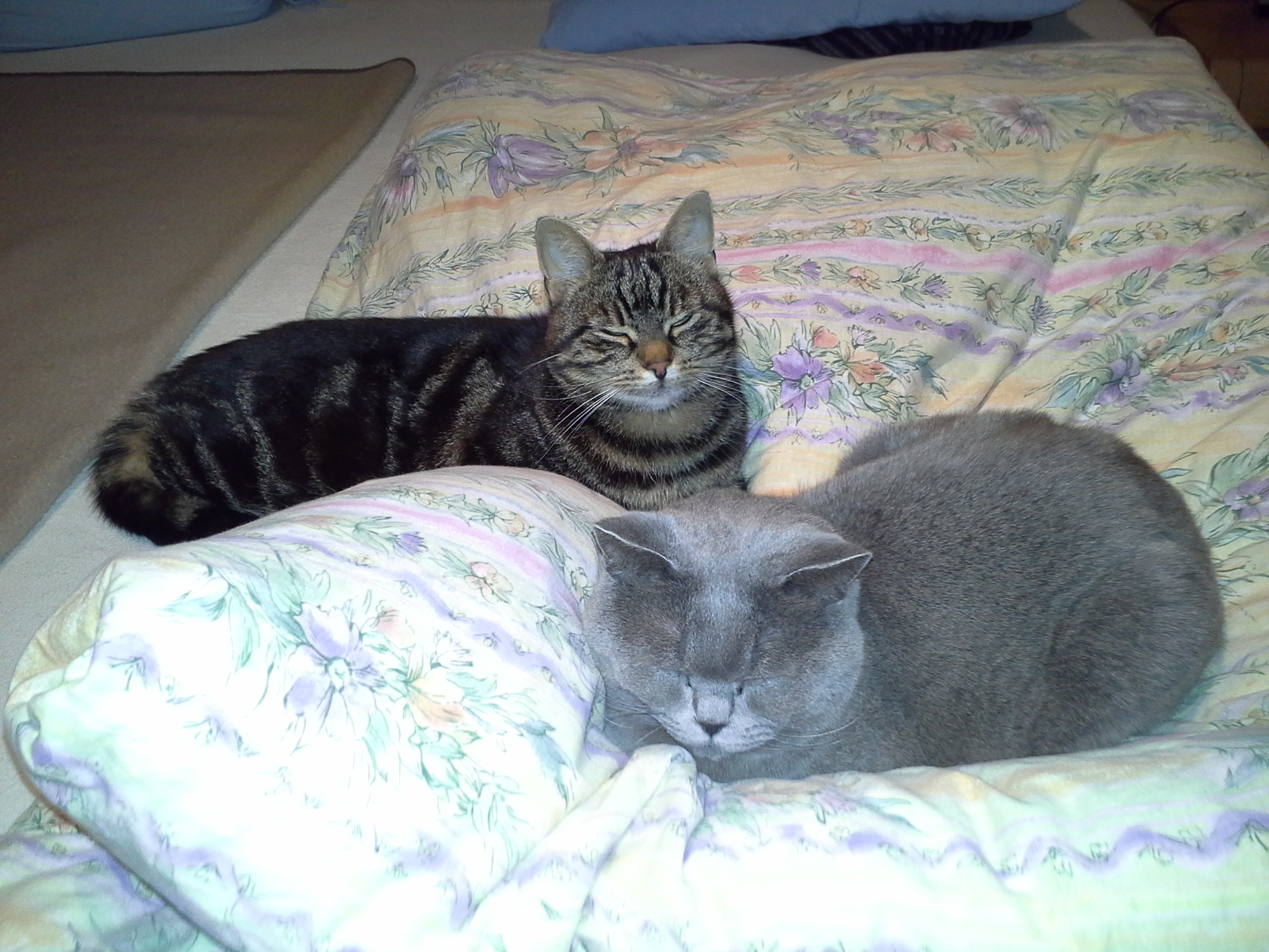 Heute abend bei Schwiegerpa im Bett. Die Kumpels Jani aus Oberösterreich und Balu der Büffel der russisch stämmige British Kurzhaar.