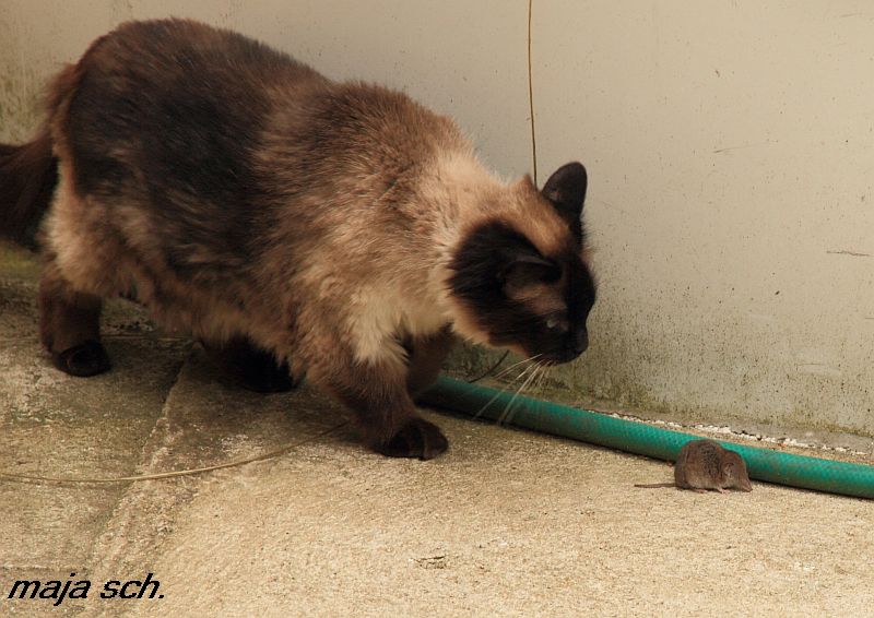 Zuerst hat er eine angebracht die ich für schon sehr angeschlagen gehalten habe, weil sie sich kaum bewegte ( so schnell war ich noch nie die Treppe hoch und Knipsapparat geholt ). Lili zeigte kaum Interesse . Ich wollte das Teil dann entsorgen aber es war noch sehr lebendig . Ließ es dann laufen dachte Sheldon wird sie schon fangen aber der wartete erst auf Lili . Die stupste die Maus in ihren Versteck ganz vorsichtig an und weg war sie . Was soll man sagen 2Katzen und die Maus kommt heil davon Sheldon ist eigentlich ein sehr guter Mäusejäger aber als Lehrer taugt er glaube nicht so viel