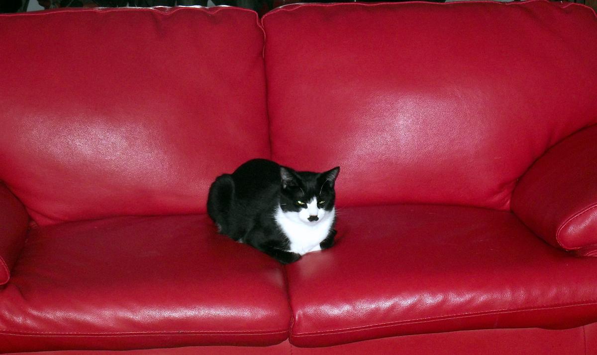 Das sieht so edel aus mit dem roten Sofa und dann wie so als Zierde die dunkle Katze