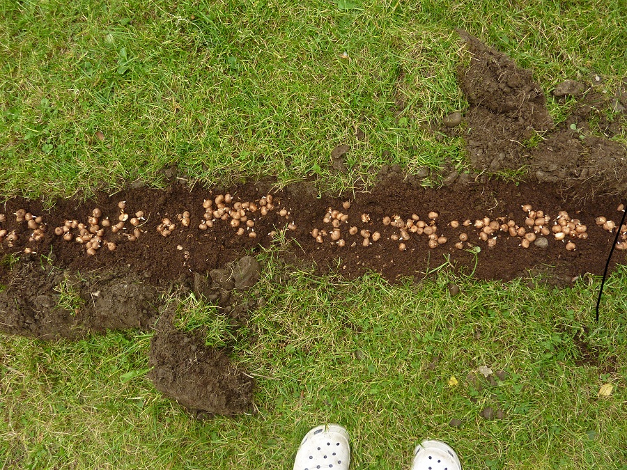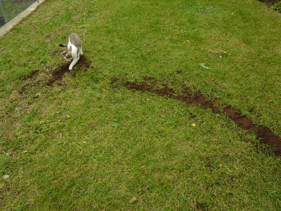 Klein Baghira hat mir heute bei der Pflanzung von 500 Krokus- Zwiebeln der Sorte "Ruby Giant" geholfen. Ich habe einen Fluss damit gemacht, der von der Terasse durch den Rasen zur Hangwiese "hinunter fließt". Schon beim Ausheben des Grabens war er neugierig zu Stelle, aber als dann erst die Zwiebeln kamen, hat er sich direkt darin gewälzt Beim zugraben hat er dann brav mitgeholfen so gut er eben konnte