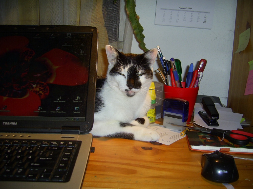 Und klar gibt es Fotos - wie man sieht, hab ich den "Kajal-Kater", er braucht jeden Morgen vor dem Spiegel eine halbe Stunde für den Lidstrich Und als Schreibtischdeko macht er sich doch auch ganz toll. Der Schreibtisch ist zwar winzig und der Kater eigentlich recht groß, trotzdem hat er es geschafft, da rumzuliegen, als hätte er allen Platz der Welt, Katzen...