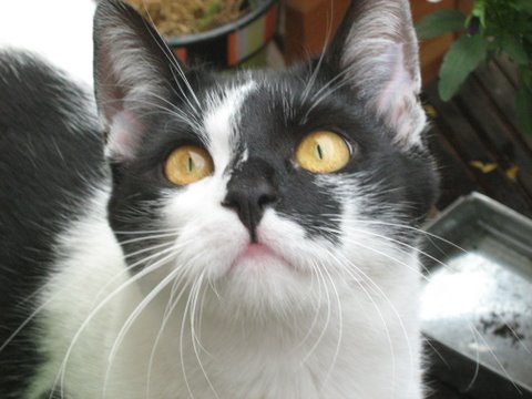 Nun haben wir noch eine dritte Miez. Sie ist aber eine "Draußen-Katze". Sie war uns zugelaufen,ist nun geimpft, sterilisiert und wir haben ihr ein warm ausgestattetes Häuschen gebaut (mit Styroporplatten ausgelegt.Das hat sie auch gut angenommen.