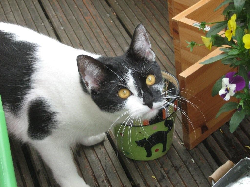 Ja, offenbar sammeln sich bei mir die "Schwarznasenkatzen", der vorige (siehe weiter oben, der Kater auf den unbequemen Heizung) hatte auch eine schwarze Nase. Dass danach Bruno bei mir einzog, war Zufall, ich hatte ihn gar nicht nach Färbung ausgesucht, aber er stand auf der Vermittlungs-Dringlichkeitsliste einer örtlichen Katzenhilfeorganisation ganz oben. Natürlich gefällt er mir trotzdem, aber ich hätte ihn auch genommen, wenn er blaukariert gewesen wäre
