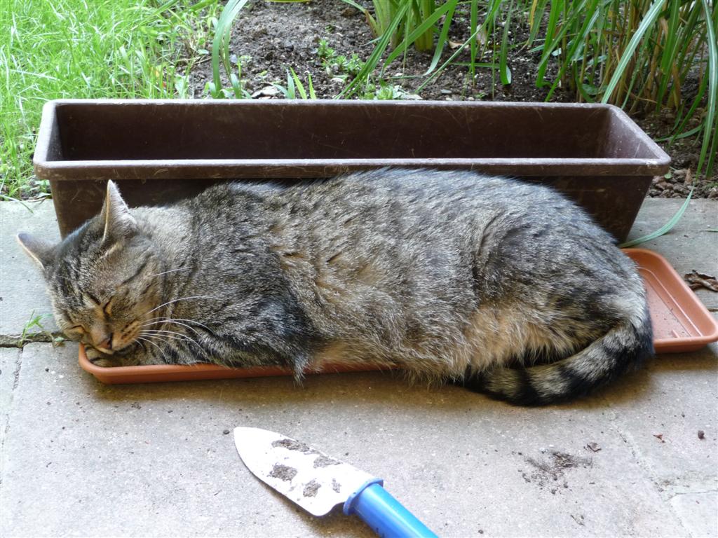 mein kater hat heute wieder schabernack getrieben, ich draußen am umtopfen und so da kommt er daher und versucht sich erst in den blumenkasten zu legen, der war im aber zu eng (7kilo kampfgewicht müssen schließlich möglichst bequem untergebracht werden) und dann hat er sich daneben in den passenden untersetzer gelegt.