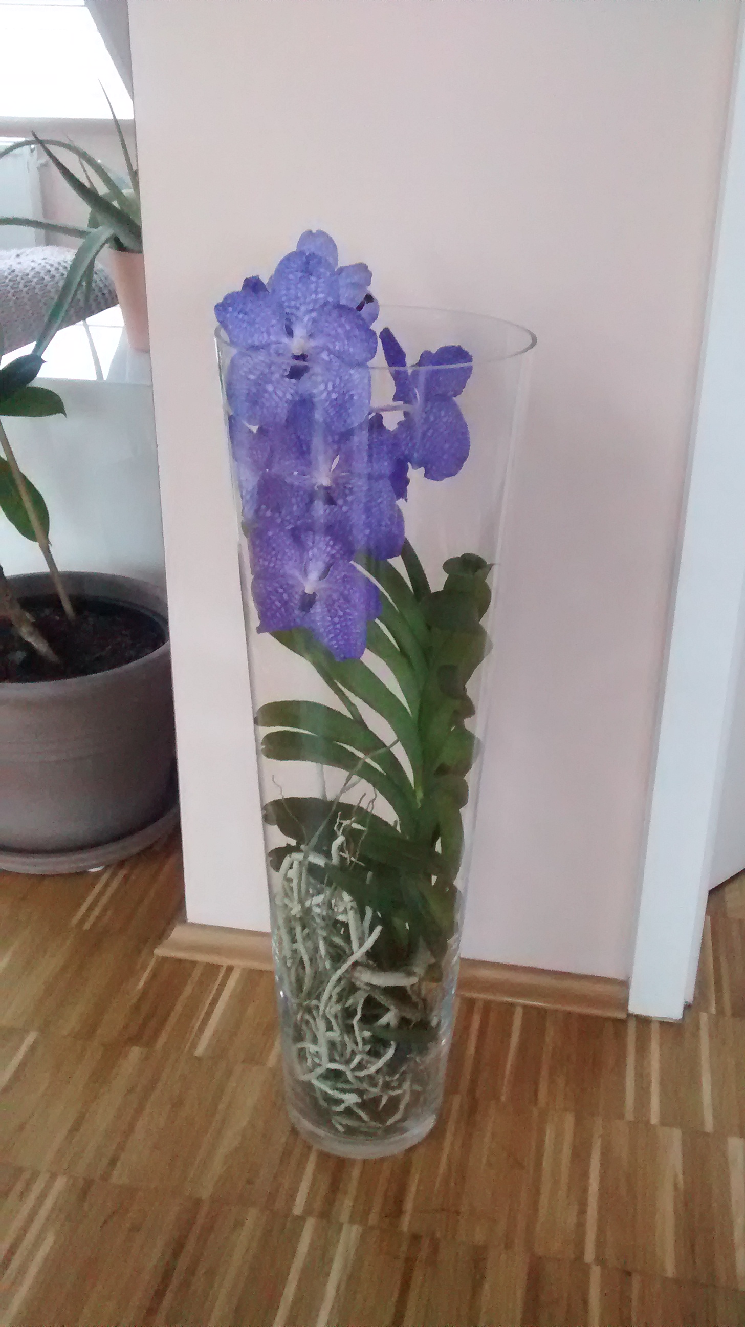 habe mir bei Obi für günstige 16 EUR eine "Vanda Orchidee" inkl 70cm Vase gekauft. Da ich sonst leider nur Phalenopsis pflege, wollte ich fragen, was es bei dieser Art zu beachten gibt? Kann ich die Orchidee in der Vase lassen oder schimmelt da irgendwann was? Derzeit sprühe ich 2-3x pro Woche großzügig rein. Anbei ein Foto der Orchidee.