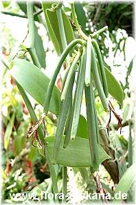 Wenn Sie Bourbon-Vanilleschoten in der Küche verwenden, haben Sie die Früchte einer Orchidee in der Hand. Die winzig kleinen Samen im Inneren der dunkelbraunen Schoten sind von einem klebrigen Mark umhüllt. Den Schoten gehen gelbe Orchideenblüten voraus, die kleiner und unscheinbarer sind als manche ihrer prächtigen Verwandten. Die Bestäubung der Blüten sollten Sie von Hand vornehmen, denn unseren heimischen Insekten gelingt nicht, was in den Tropen Kolibris übernehmen. Im Inneren der Blüten muss eine zungenförmige Lasche beiseite gedrückt werden, die den männlichen Pollen von der weiblichen Narbe trennt. Mit einem schmalen Werkzeug (z.B. Zahnstocher) können Sie den Schnabel der Kolibris imitieren und die Blockade vorsichtig lösen, während Sie die Blüten leicht schütteln. Tun Sie dies, sobald die Blüten geöffnet sind (am besten am frühen Morgen) und der Pollen wird auf die Narbe übertragen. Sie brauchen dazu jedoch zwei Vanille-Orchideen, die nicht von ein und derselben Mutterpflanze abstammen.