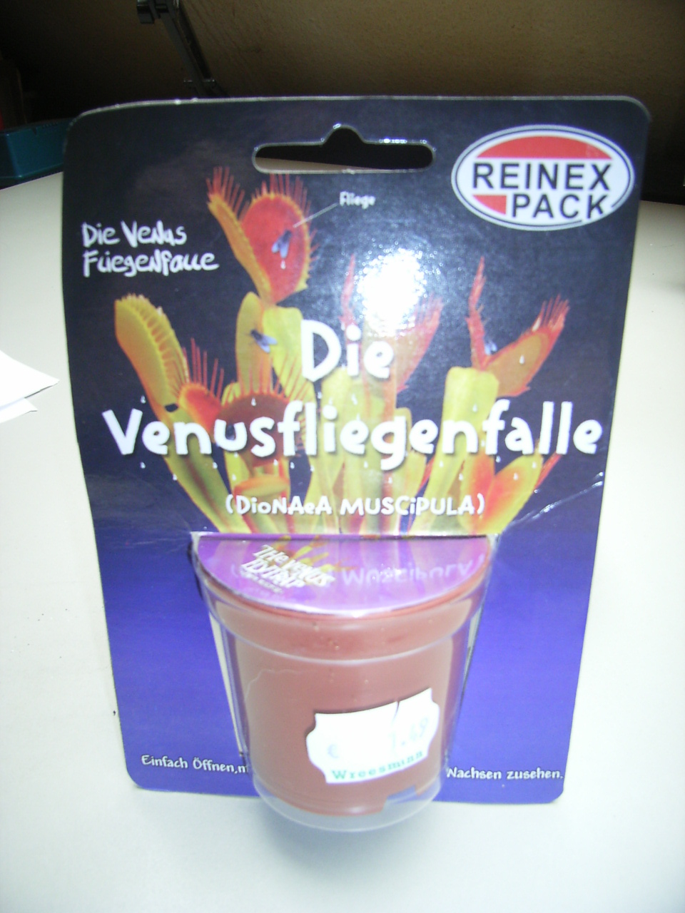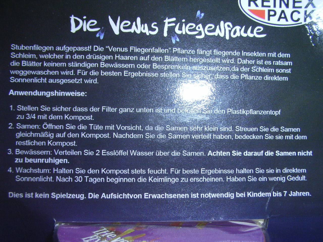 hab ich mich so umgeschaut und sah dann "Venus Fliegenfalle - Einfach öffnen, mit Wasser begiessen und beim Wachsen zusehen. Ganz einfach". Da immer noch genügend Leutchen vor mir waren, hab ich mir die Rückseite durchgelesen und dachte mir, den Spaß machste dir einfach mal!