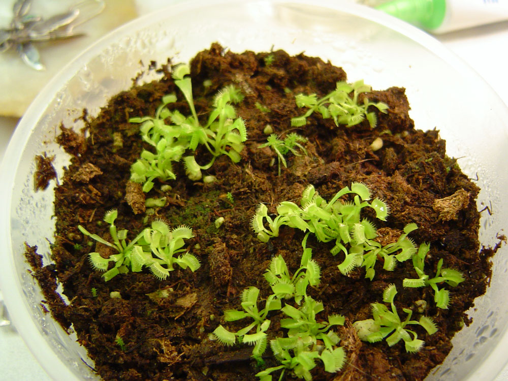 Und dann kamen Blattläuse ins Spiel die bis auf die Dionaea alles nieder machten. Zu erkennen daran, das die Blätter anfangen schrumplig zu werden. Kurz vor der Winterruhe hatte sie aber noch kräftig geblüht und auch Samenkapseln ausgebildet. In einigen waren auch kleine schwarze Samenkörner su finden, die ich dann im Frühjahr einfach mit zu der Mutterpflanze ausgesät hatte. Nun sehe ich das mehrere Keimlinge herauskommen, bei denen ich mir aber nicht sicher bin was es ist. Sehen so die Keimlinge von der Venusfliegenfalle aus?