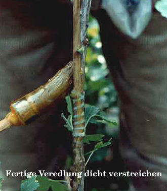 Die Veredlung muss ganz dicht und fest verbunden werden. Bast war von jeher das Bindmaterial dazu; er ist aber durch den - OSV - Okulations-Schnellverschluss - abgelöst.