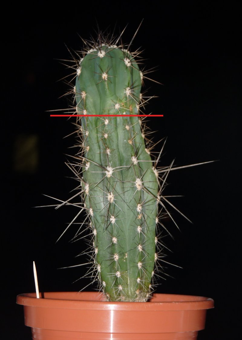 Ich besitze eine vergeilte Stetsonia coryne. Dieter hat mir voriges Frühjahr geraten, einen Kopfsteckling zu machen, wenn wieder genug normaler Wuchs vorhanden ist. Jetzt frage ich mich: Soll ich im April oder Mai schon Hand anlegen? Oder lieber noch ne Weile warten? Schneiden wollte ich an der rot markierten Stelle.