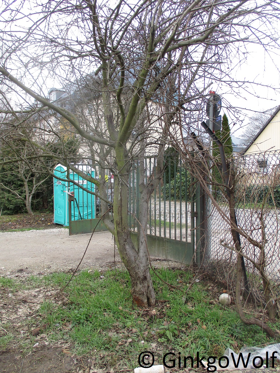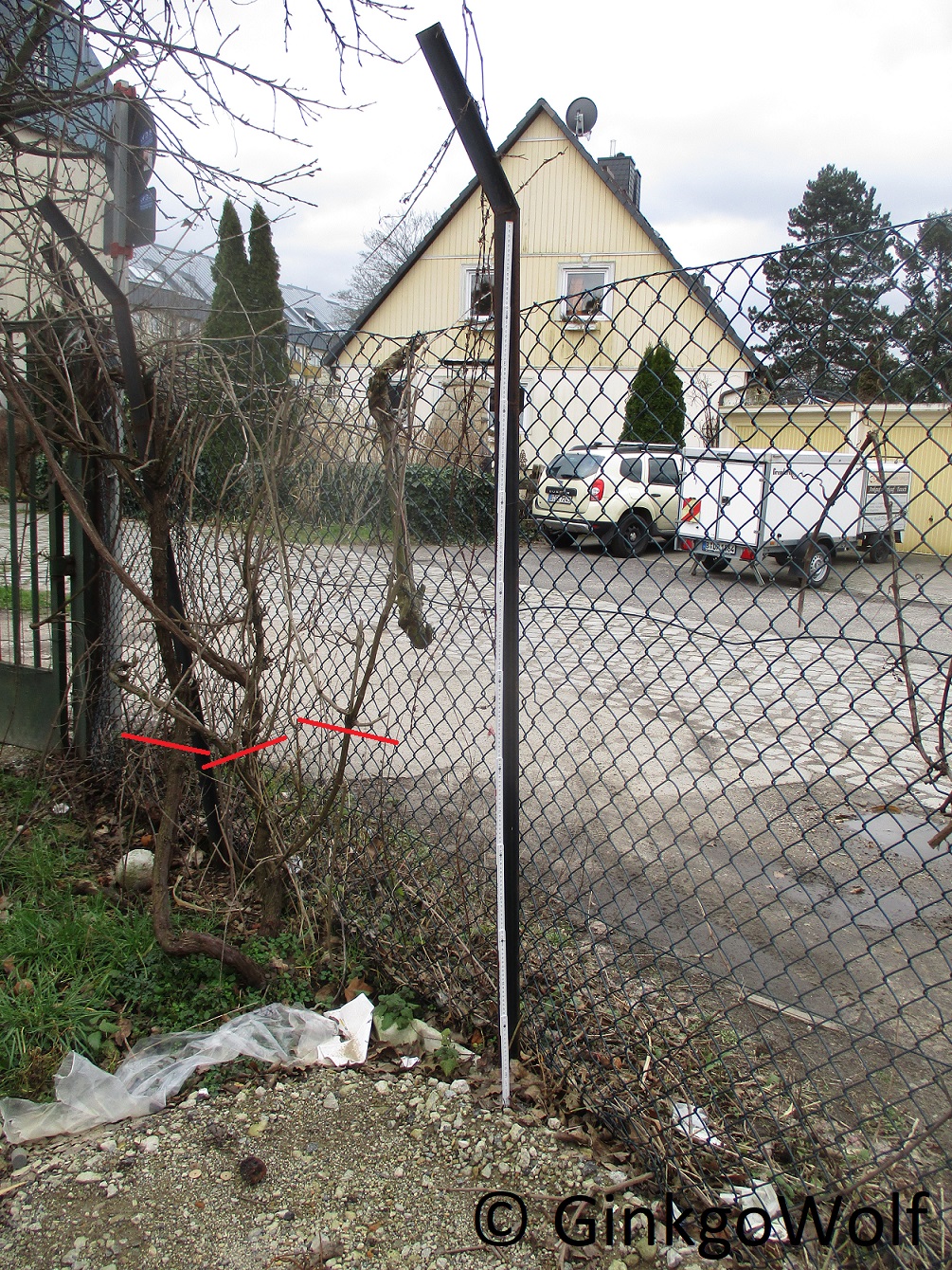 Also links und rechts jeweils vom Tor ist ein Stock. Der auf der rechten Seite, da steht links noch ein Apfelbaum daneben (der bleibt auch stehen, der Baum). Der Weinstock auf der linken Seite vom Tor... da steht grad leider das Dixieklo der Hochbauarbeiter halb davor. der Weinstock ist rechts neben dem Klo zu sehen.