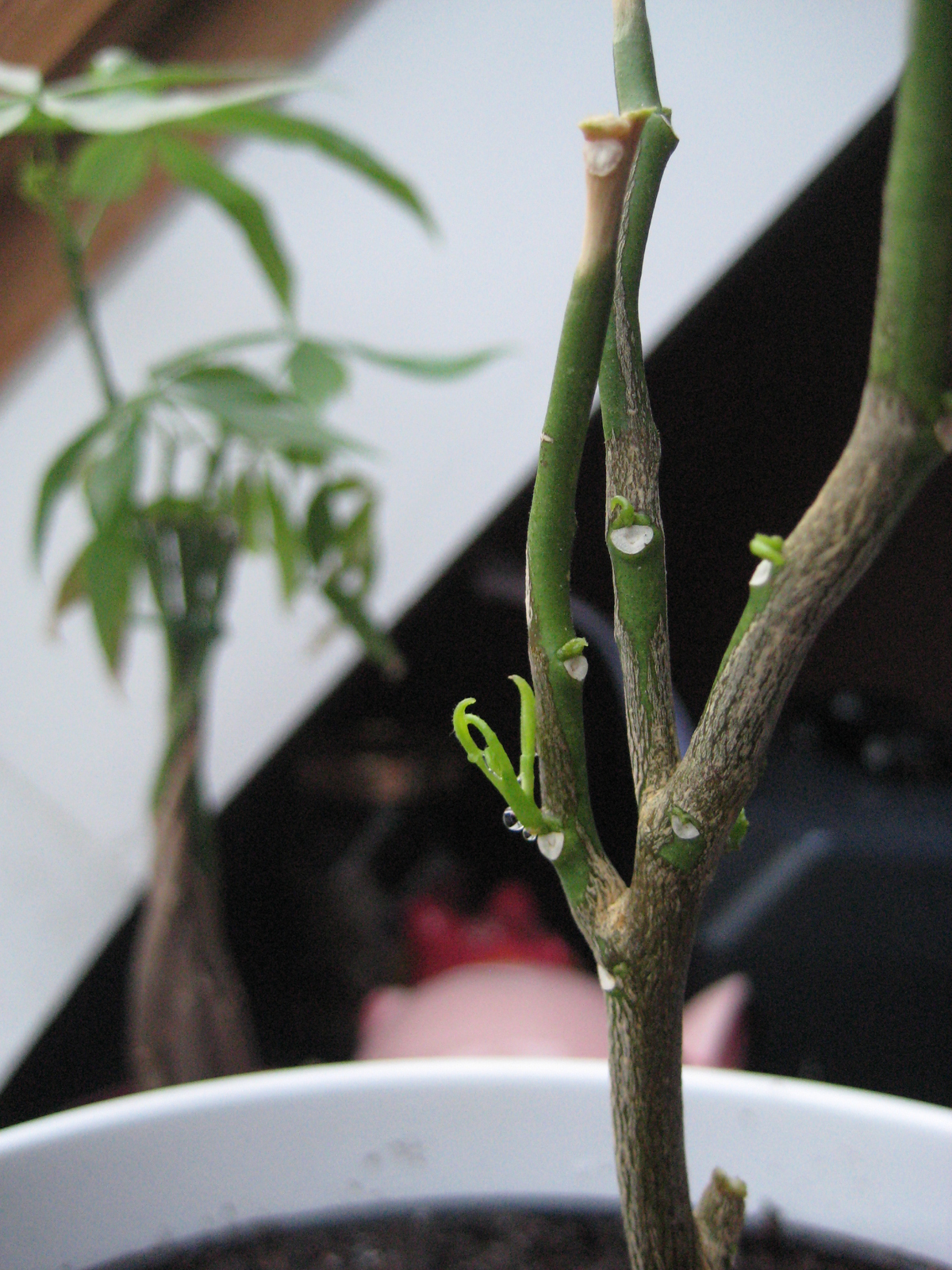 Gerade habe ich mir gedacht, das ich ihn jetzt mal wegschmeiße, und was seh ich da? ein paar kleine neu entstehende blätter und das an mehreren stellen. Die sehen richtig frisch aus.