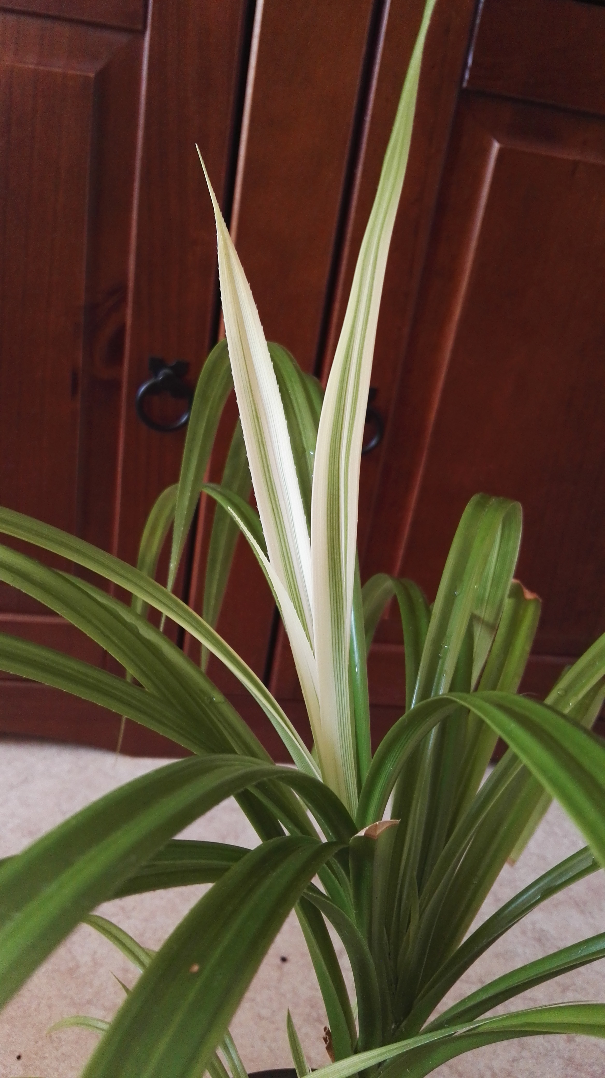 Nun bildet sie statt grüner Blätter, weißliche mit grünen Streifen aus. Nun frage ich mich, ob es am neuen Standort liegt oder vielleicht ein Virus ist.