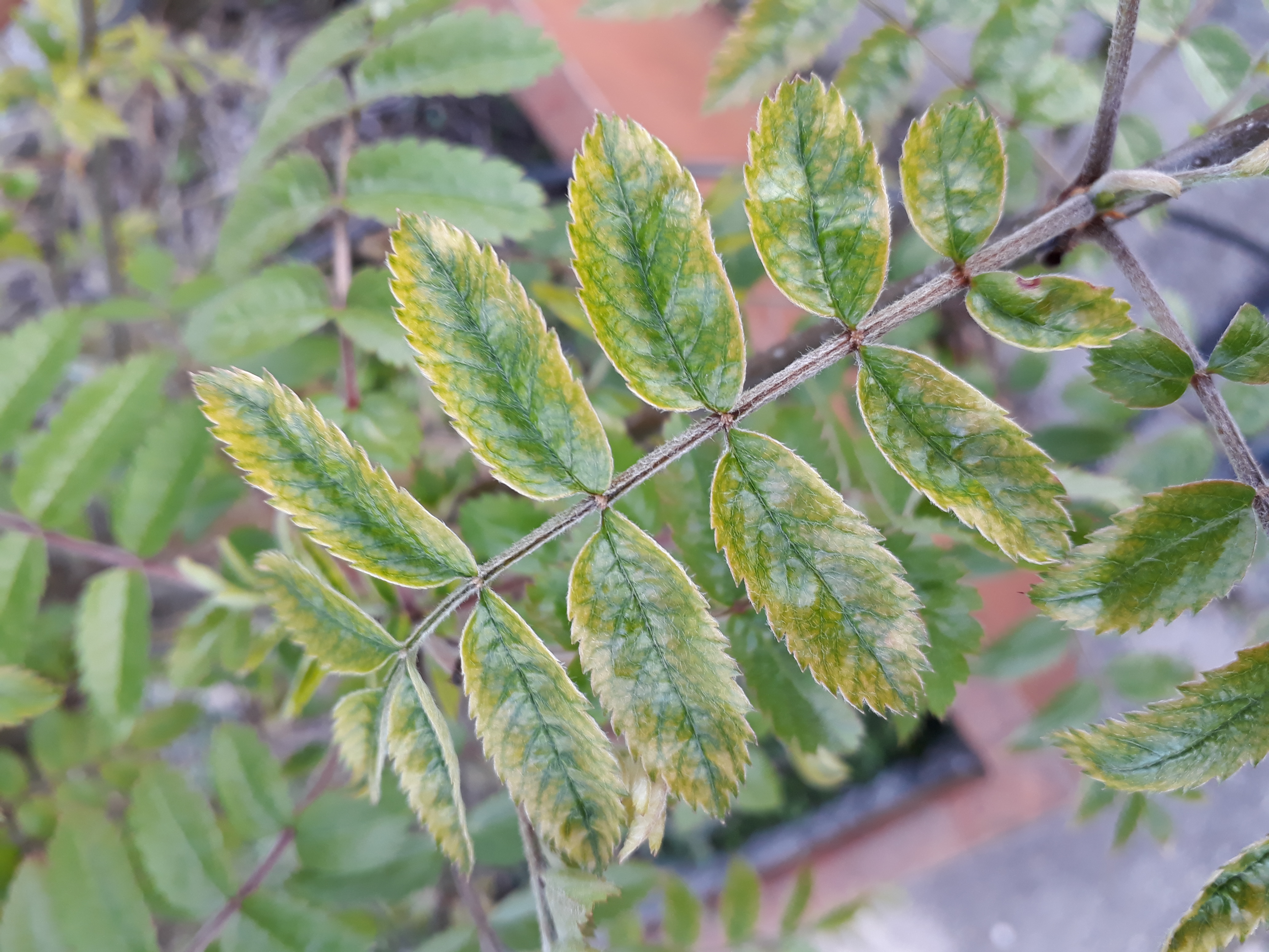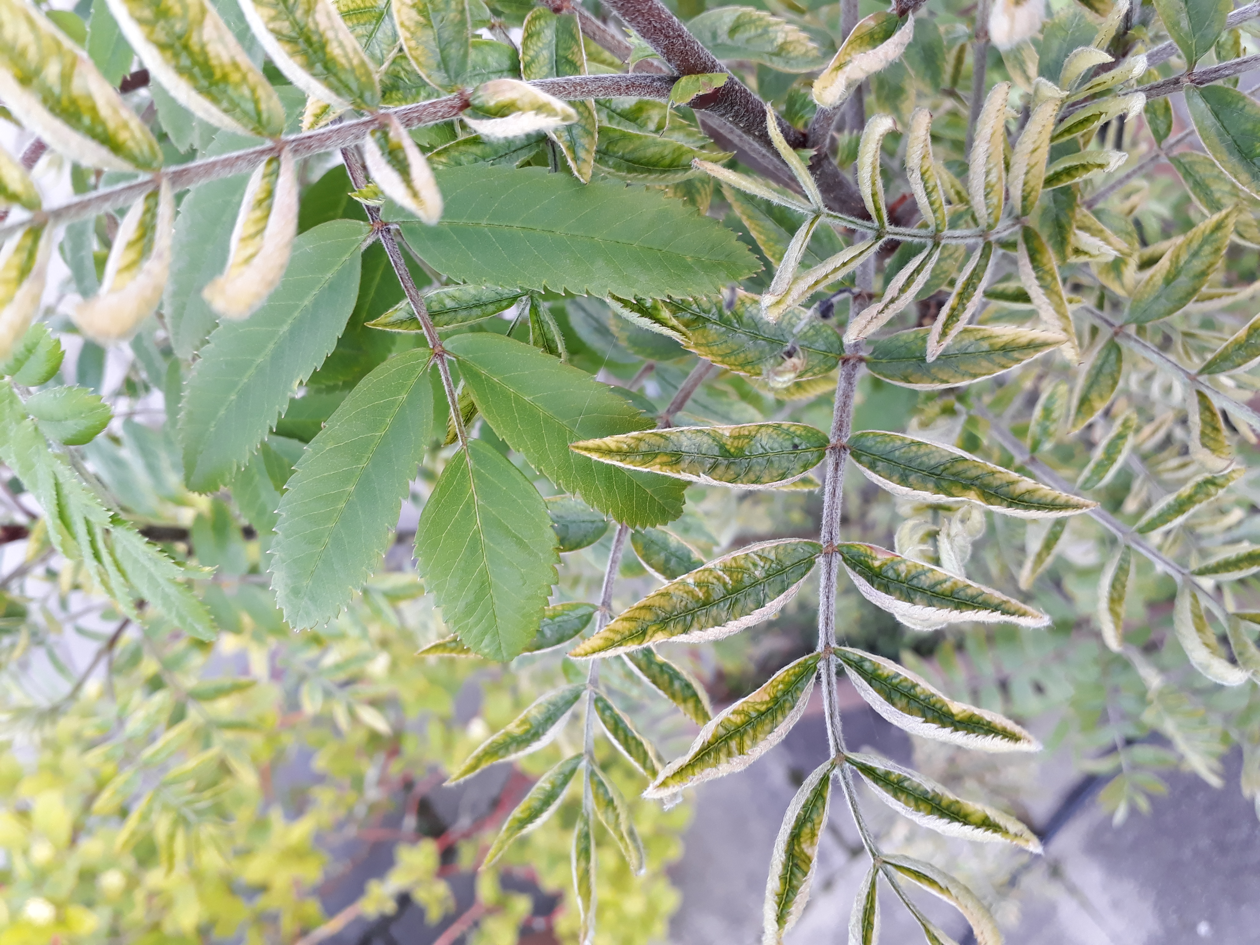 Soeben habe ich festgestellt, dass bei einigen Ästen die jungen Blätter deformiert und verformt sind. Am Rand gelb und hochgerollt.