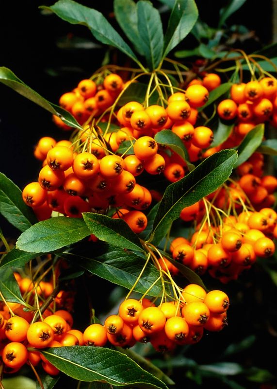 Auch der Feuerdorn (Pyracantha) schmückt sich bis weit in den Winter hinein mit zahlreichen erbsengroßen Früchten. Ihr Farbspektrum umfasst die unterschiedlichsten Nuancen von strahlendem Gelb über Orange bis zu leuchtendem Rot. Die dunkelgrünen, länglichen Blätter bleiben je nach Temperatur bis in den Winter oder sogar bis zum Neuaustrieb im Frühjahr an den dornigen Trieben haften. Der Feuerdorn kann etwa 1 bis 3 m hoch werden. Dieser anspruchslose Zierstrauch eignet sich für die unterschiedlichsten Gartensituationen und kommt sowohl einzeln als auch in einer Gruppe gut zur Geltung. Er ist gut schnittverträglich und eignet sich deshalb nicht nur für freigewachsene, sondern auch für geschnittene Hecken. Sehr schöne herbstliche Bilder entstehen, wenn man den Feuerdorn mit Hilfe eines Spaliers an einer Hauswand in die Höhe wachsen lässt.