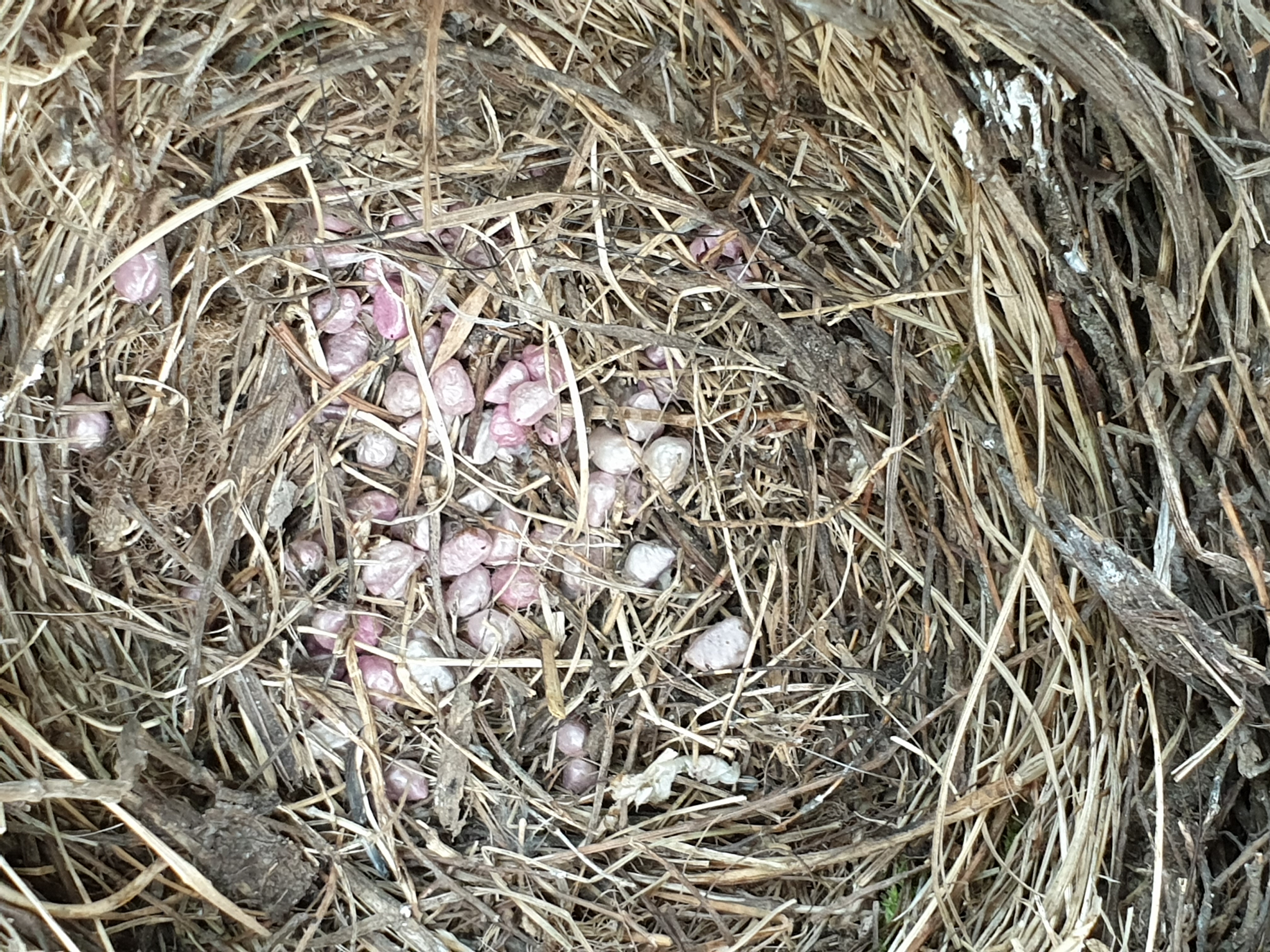 Wir haben auf unserem überdachten Holzstapel ein leeres Vogelnest gefunden. Die Mätzchen (leider hab ich nicht gesehen, wer hier ggf brütete) waren schon ausgezogen aber haben lauter kleine < 5 mm Klumpen - rose bis weiß-bläulich - hinterlassen, die wie PVC-Granulat aussehen.