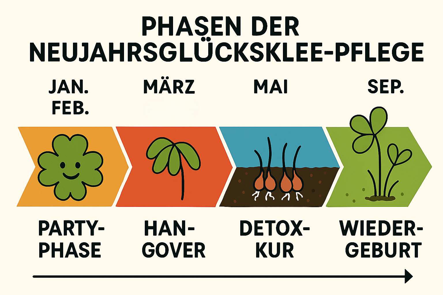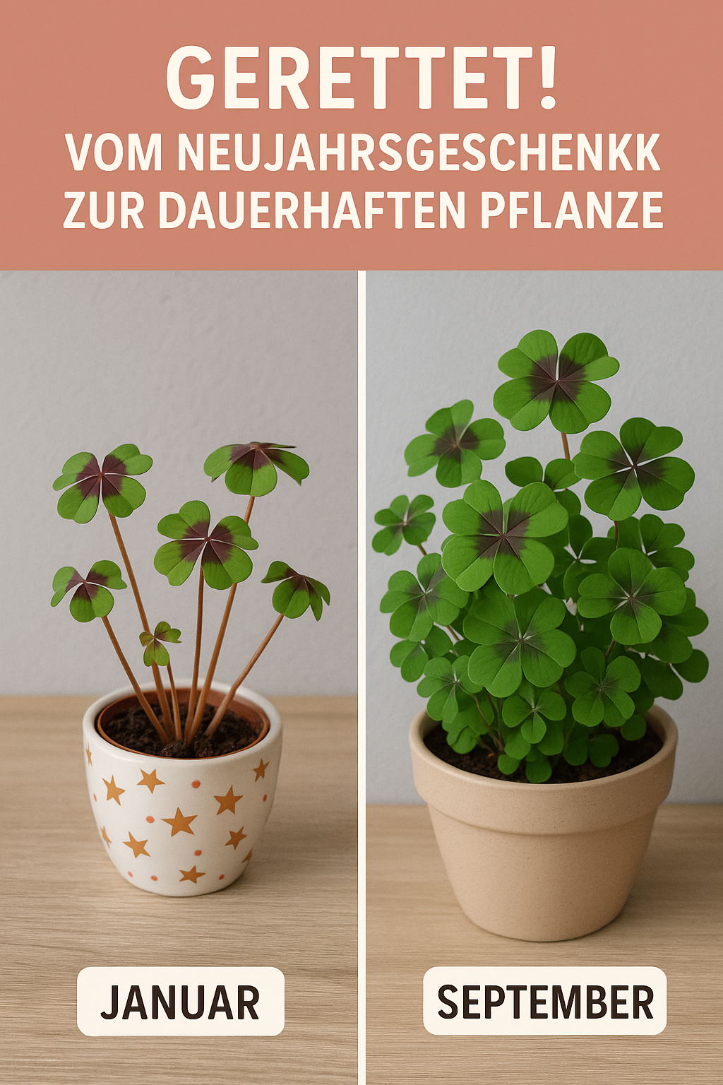 Nach einigen Wochen werden die ersten neuen, kräftigen Blätter sprießen. Ihr Glücksklee hat seinen natürlichen Rhythmus wiedergefunden!