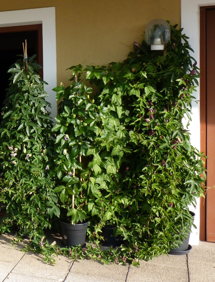 Hab hier ein Foto von meiner Passiflora xviolacea (ganz rechts) - die hab ich zuerst die Bambusstäbe raufwachsen lassen, dann wieder runter und am Boden wuchs sie dann noch über einen Meter weiter. Die schafft also ein paar Meter im Jahr und blüht schön. Einziger Nachteil wäre, wenn du eine caerulea pflanzt, dass sie halt im Winter zurückfriert. Und dann wär noch was ganz wichtiges zu beachten! Wie viel Sonne gibt es dort!