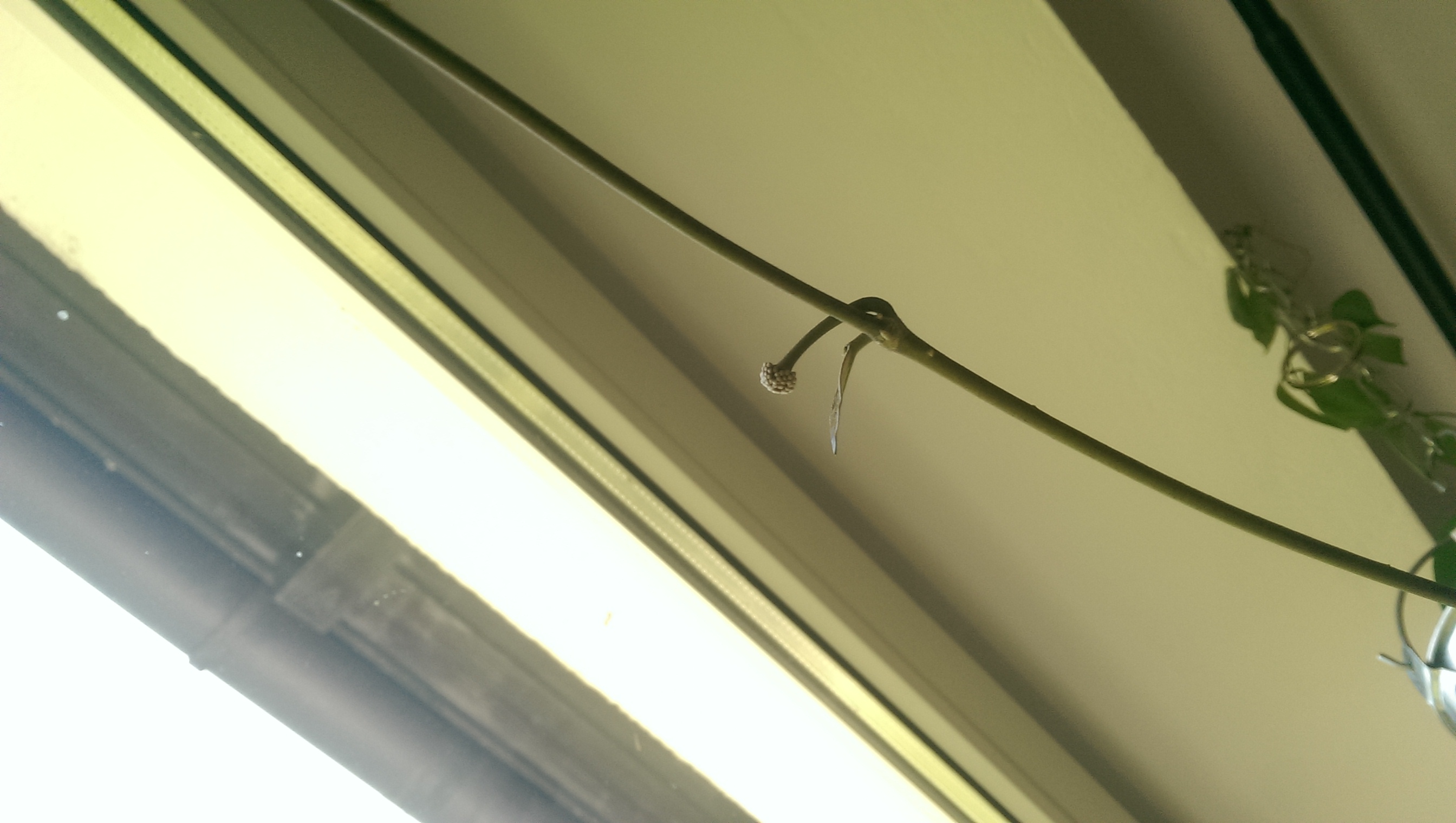 Übrigens habe ich ja auch eine 'Red Button', zwar ein Jahr jünger als die 'Silver Pink', aber die steht im immer warmen Wohnzimmer, und die macht nicht die geringsten Anstalten Pedunkel auszubilden. Unglücklicherweise liess ich sie die Stehlampe hinauf ranken (ich wusste, irgendwann würde ich es bereuen, aber die Lampe ist halt ein prima Rankgerüst), aber jetzt merke ich, dass sie eigentlich im falschen Zimmer steht.