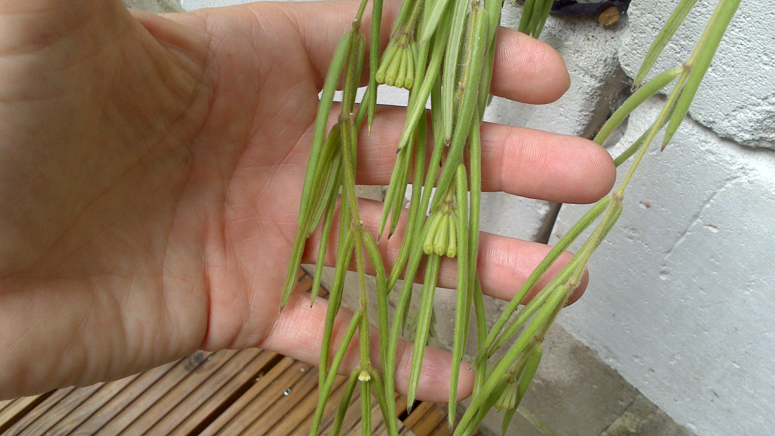 Ja, Paula, solche Hoyablüten, wo die Blütenblätter so nach hinten 'geklappt' sind, gibt's. Ich hab mein schlaues Hoyabuch hervorgekramt und finde, Deine Blüte sieht exakt wie jene der Hoya subquintuplinervis oder Hoya pachyclada aus, beim Blatt bin ich mir jedoch nicht ganz sicher. Die Größe ist anhand Deines Fotos nicht erkennbar, die Form würde jedoch passen. Einen leichten Flaum haben die Blätter dieser Hoya jedoch, was wiederum passen würde. Aber wie gesagt, ich bin nicht sicher - es gibt so viele Hoyas, die sich ähnlich sehen und dazu noch jede Menge Variäteten und Kreuzungen...