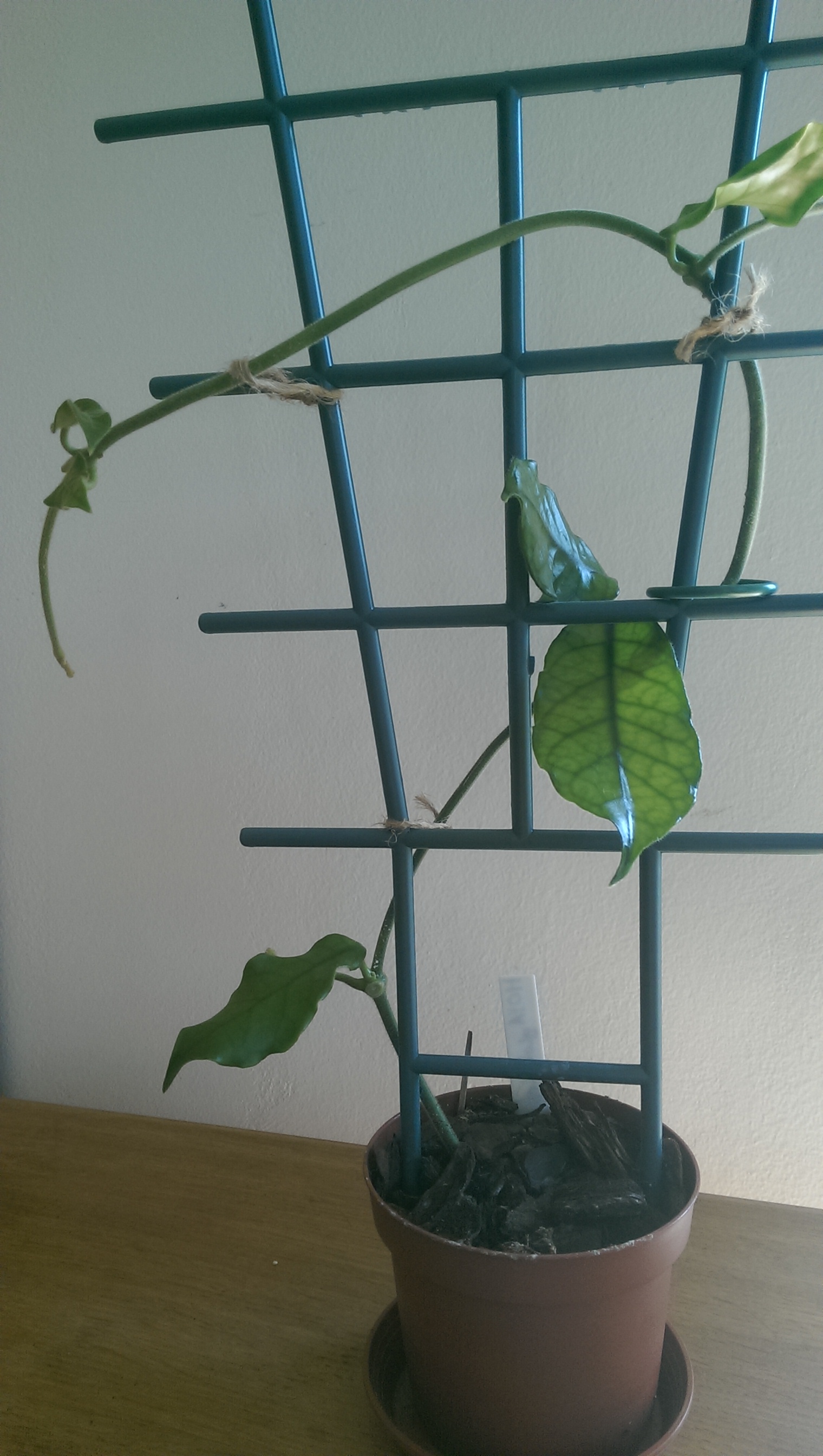 Paula, anhand Deiner neuen Bilder tendiere ich eher zu H. pachyclada. Die Internodien an dem neuen Trieb sind in relativ langen (normalen) Abständen voneinander entfernt. Da Deine Pflanze noch in einem Jungpflanzen-Stadium ist, ist das aber ohne Gewähr. Sollten die Internodien weiterhin in diesen Abständen kommen und nicht in sehr, sehr kurzen (ca.1cm, sieht aus, als wären Büschel von Blättern an der Ranke), kannst Du davon ausgehen, eine H. pachyclada zu haben. Die Blätter passen dazu auch besser. Zumindest vom Foto her.