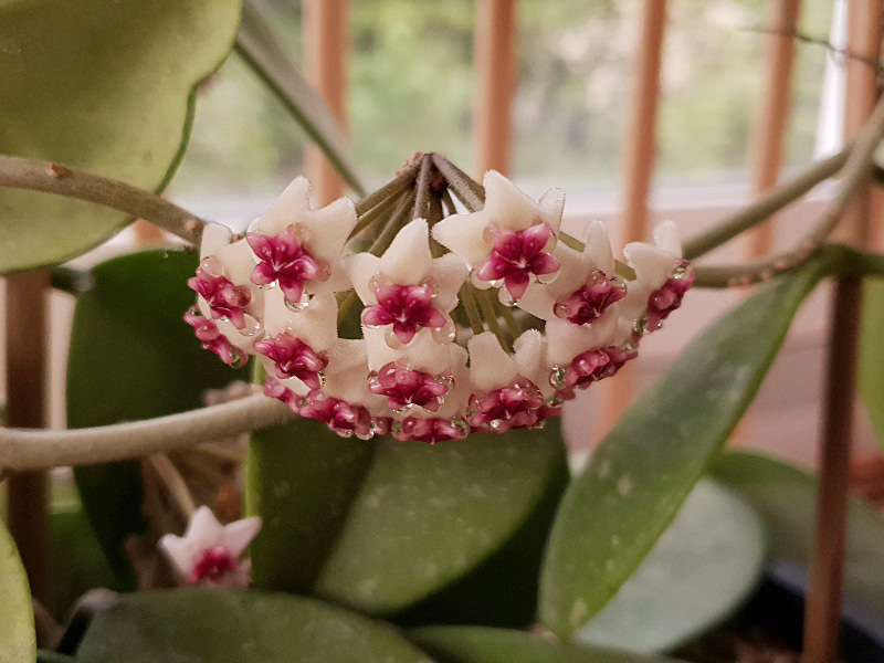 Hoya bhurmanica steht im Bad; nicht gerade ideal, aber das Umstellen dorthin hat sie nach dem schrecklichen Winter wohl gerettet. Für einen besseren Standortvorschlag bin ich offen.