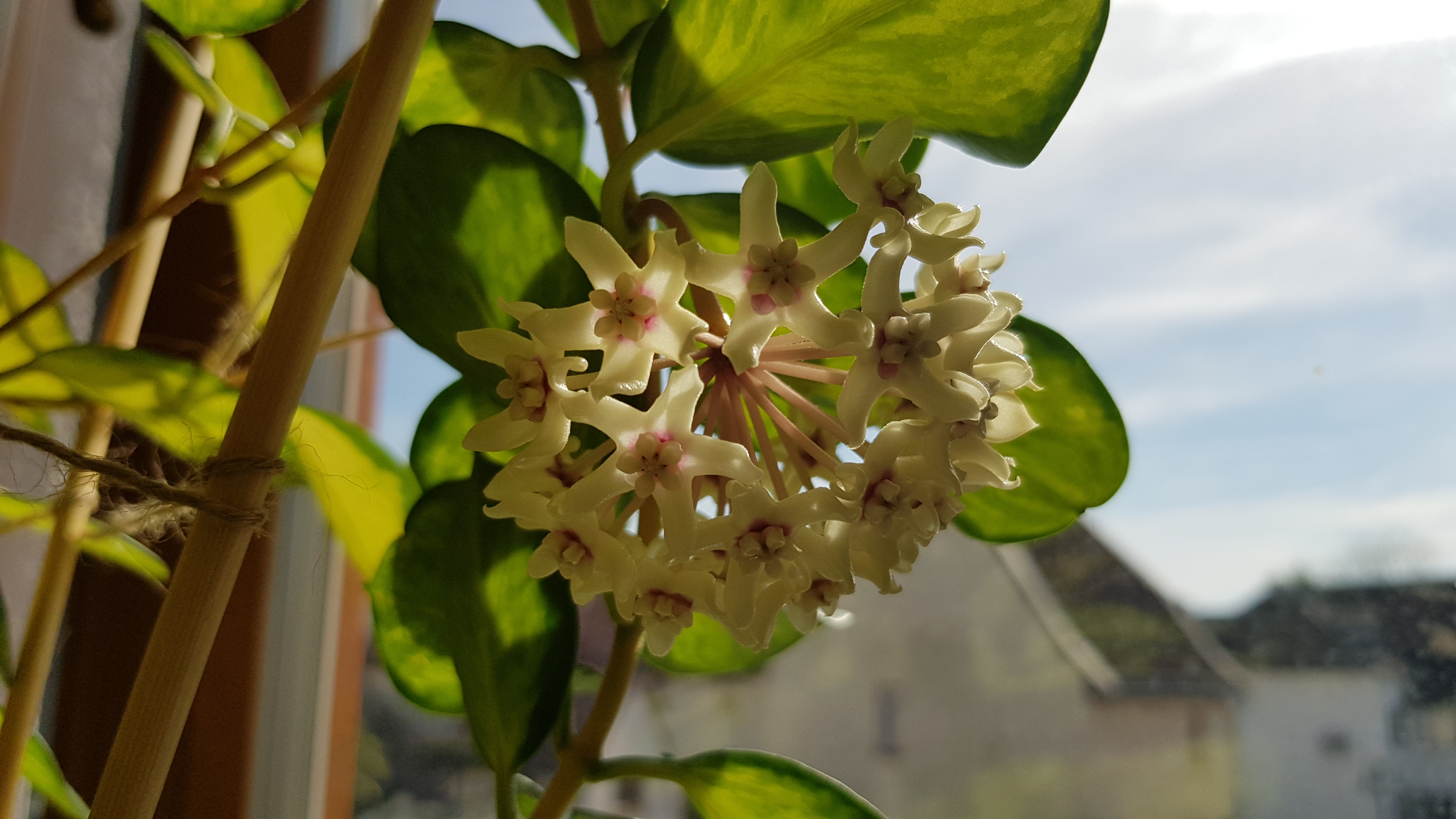 Bei mir gings dieses Jahr schon früh los. Vor einigen Wochen zeigte sich ein Blütenansatz meiner jungen Hoya. Ich habe sie erst letztes Jahr (noch ganz klein) gekauft und sie wuchert und wuchert fröhlich vor sich hin. Ich habe ihr inzwischen erfolgreich das Ranken beigebracht und sie scheint sich sehr wohlzufühlen.