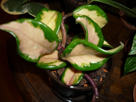 Wachsblümchen: tolle Hoyas hast du da! Was ist das für eine Hoya mit dem Bogen auf dem Tablett? Sieht aus wie Efeutüte