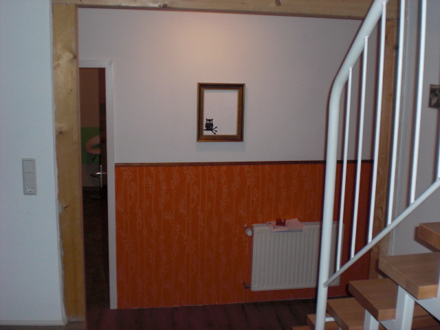 Aber da wir ja die gesamte Flurlänge unten schon orange tapeziert haben, hab ich mich oben nicht mehr bunt getraut. Da musste dann halt irgendwas beklopptes in den Bilderrahmen.
