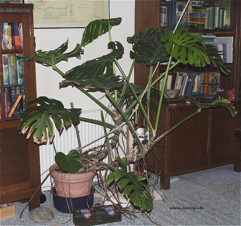 Meine Monstera hab ich jetzt seit genau 30 Jahren. Im Januar 1983 verkaufte man sie mir, nachdem sie im Blumenladen begann, die Blätter abzuwerfen. Ich hab damals 40 DDR-Mark für das Teil bezahlt (die war ca. 1,50 m hoch und hatte schon gelochte Blätter) und seitdem begleitet sie mich. Inzwischen sind die Blätter teilweise über 40cm breit. Eine der unkopliziertesten Pflanzen, die es gibt. Nie Schädlinge, immer gut aussehend und ein "Aha-Effekt" beim Besuch *g*. Ab und an schneid ich für jemanden mal nen Ableger, bei einer Bekannten hat ein Kopfsteckling nach 4 Jahren geblüht und auch Früchte getragen. Die rankt sich durch den Wintergarten, Südseite und im Winter kuschlig warm. Allerdings waren die Früchte nicht genießbar. Die sollen (bei vorsichtiger Verkostung) beißig gewesen sein und stachlig?