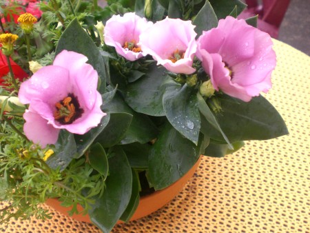 ich habe zum Muttertag eine schöne bepflanzte Schale bekommen. Nun weiß ich allerdings nicht was die eine für eine Pflanze ist. Vielleicht kennt die ja jemand von Euch. Die Blüten sind eigentlich mehr fliederfarbend als rosa.Die Blätter sind sehr fest, glatt und fleischig.