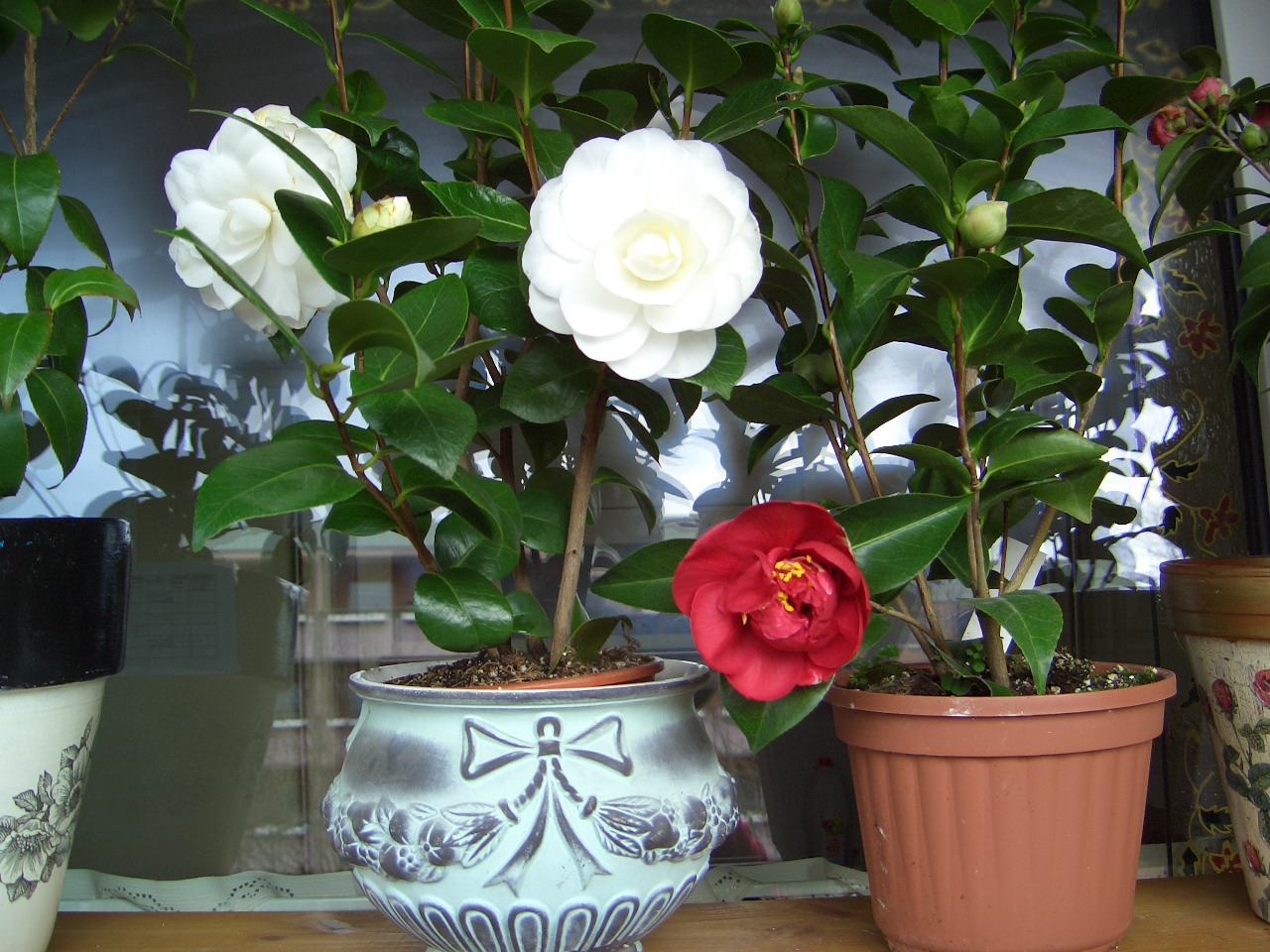 Die rote Kamelie ist noch nicht ganz offen, die ist so Phäonienblütig. Die weiße ist bei mir dieses Jahr neu dazu gekommen.