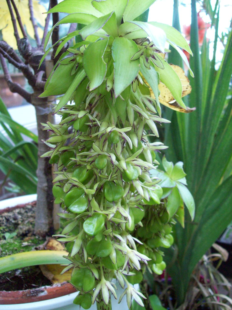 Das schöne an Eucomis ist ja, daß der Blütenstand immer gut aussieht; nicht nur während der Blüte, sondern schon lange, bevor die Blüten aufgegangen sind, und auch noch einige Zeit, nachdem sie abgeblüht sind.